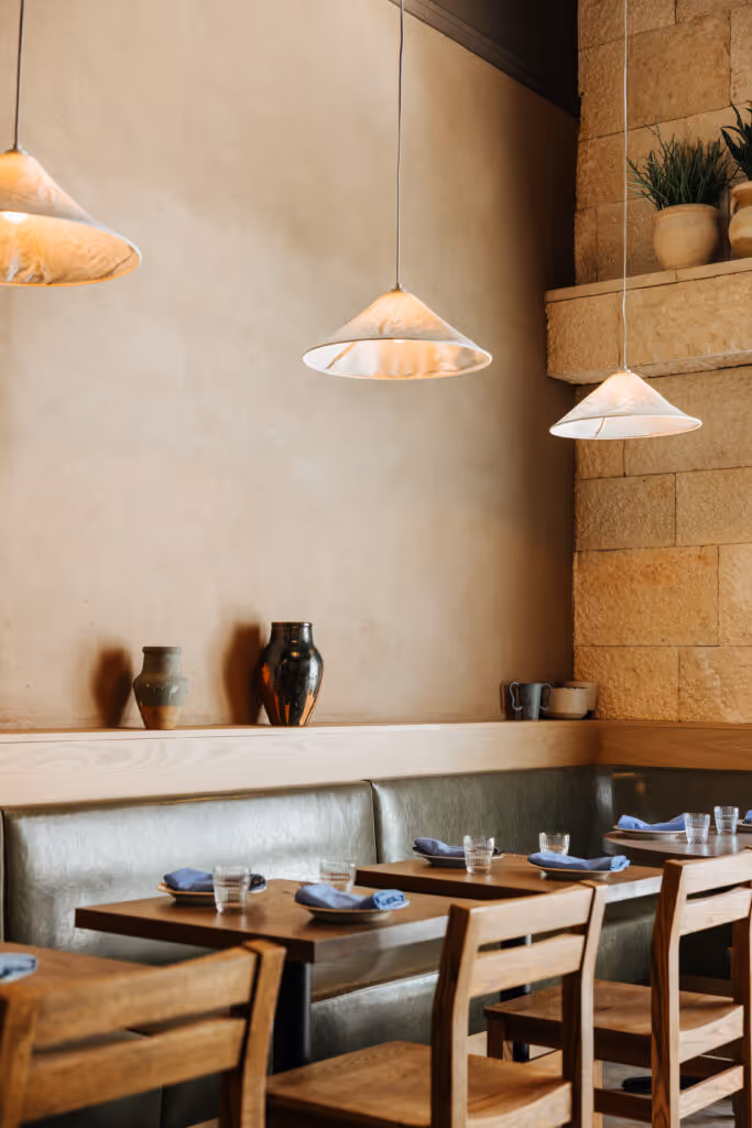 Named for their fathers, each of whom played a pivotal role in shaping Demetri’s Greek-American heritage, Gus & Marty’s is as much about family as it is about exceptional food. The space, crafted by Sarah Carpenter Studio, fuses warm, rustic elements–think limestone walls and marble floors–with playful nods to Demetri’s and Sarah’s own lineage. Quite literally, in fact: ceramic busts of their fathers and vintage family portraits line the walls.