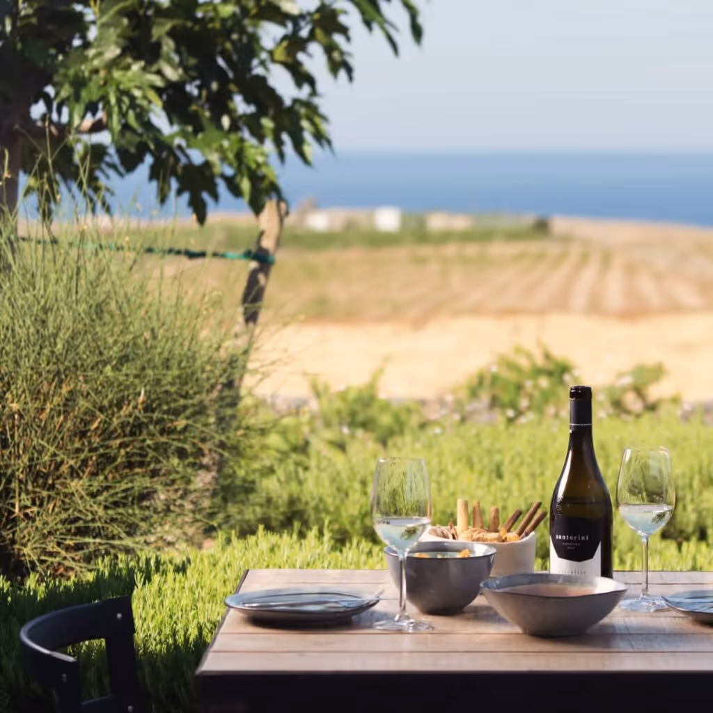 Known for its distinctive Assyrtiko, wine tastings are a must during any visit. Perched in the middle of the island, Vassaltis Vineyards blends tradition with innovation, offering a selection of wines that artfully showcase the essence of Santorini’s volcanic soil. Enjoy a guided tour through the grounds before being seated for a formal pairing.