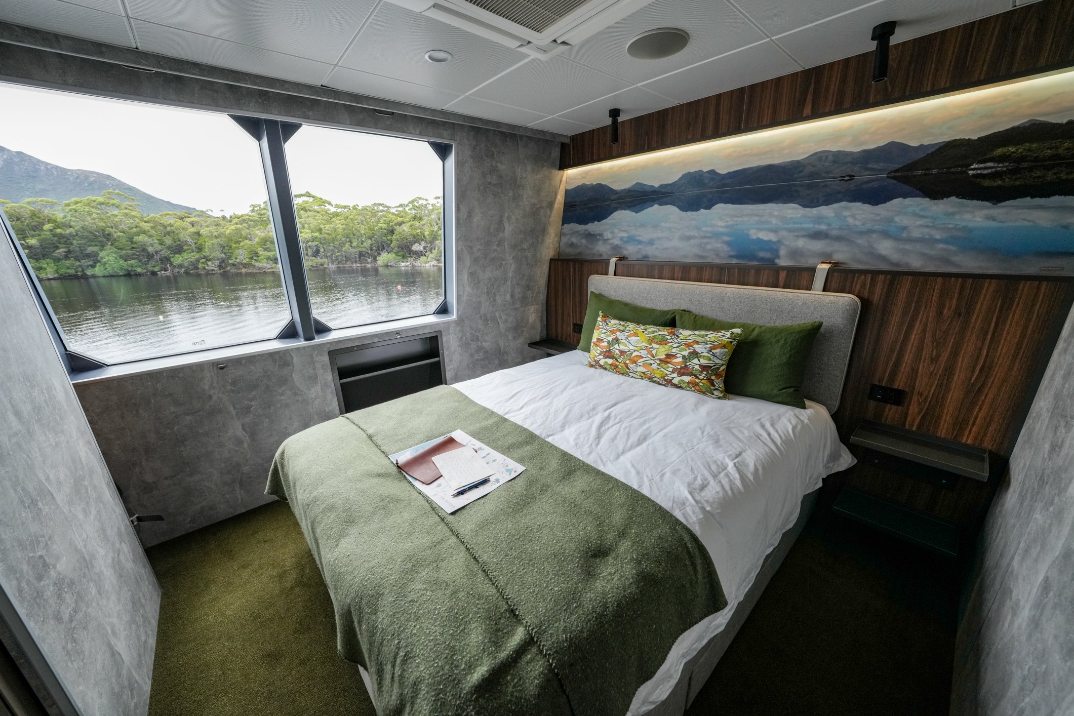 Coastal cabins have the same setup, but are slightly smaller than the suites. Striking artwork by local Tasmanian artists hung above the bed, as it did throughout the entire vessel. Furniture onboard and in the staterooms is almost exclusively crafted by local artisans as well. You’ll need the appropriate Australian plug adapter for charging your devices.