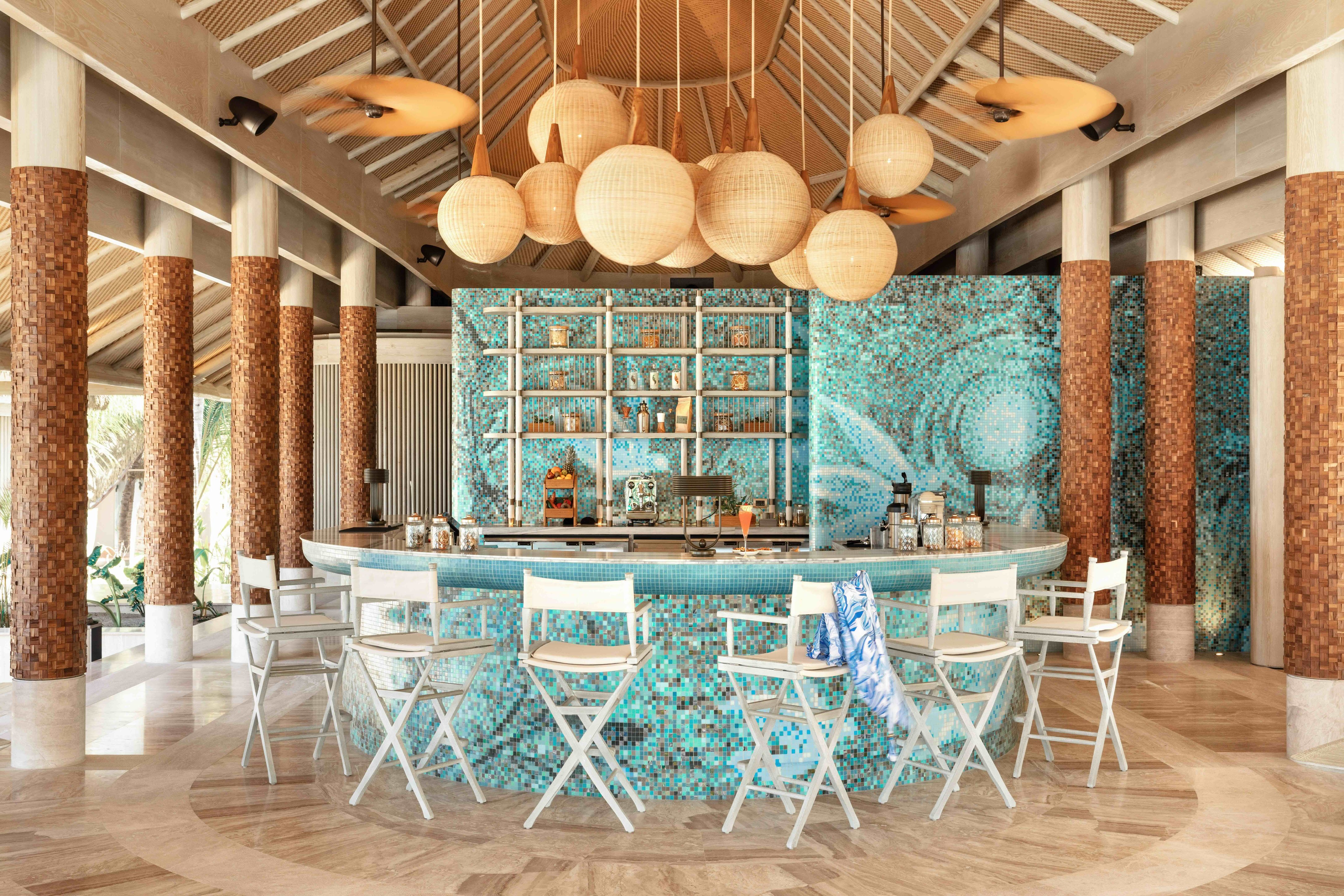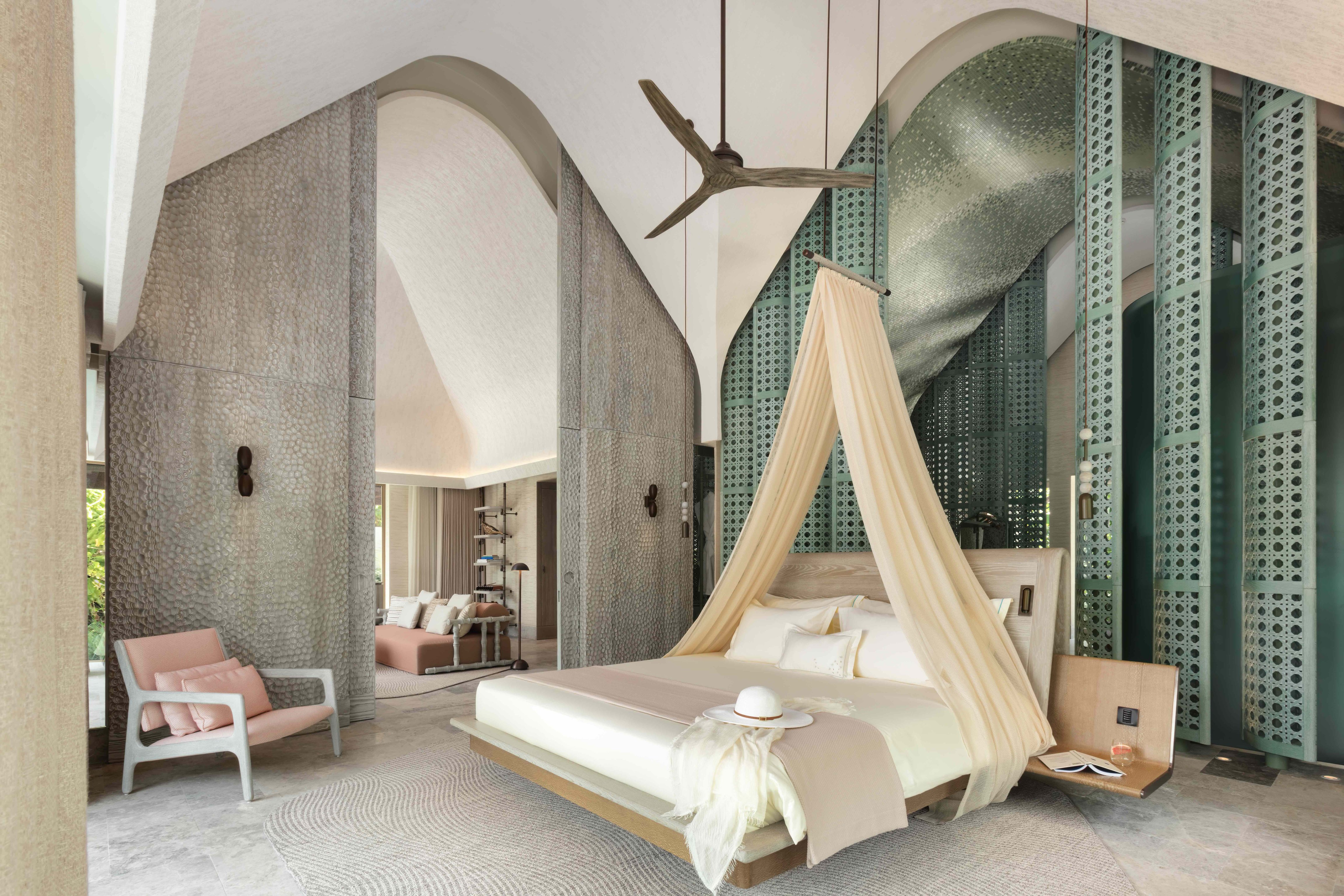 Jutting out into the bay, curved wooden walkways lead to overwater bungalows with direct access to the lagoon—it’s quintessentially Maldivian in the best way. Inside, floating beds, open-air layouts, and private plunge pools immerse you into paradise. Soft seafoam greens and pale coral tones are accented by sea-glass-style rain showers and mosaic tile ceilings, while the freestanding bathtub—perfectly framing the Indian Ocean—might just be the best bath view I’ve encountered to date.