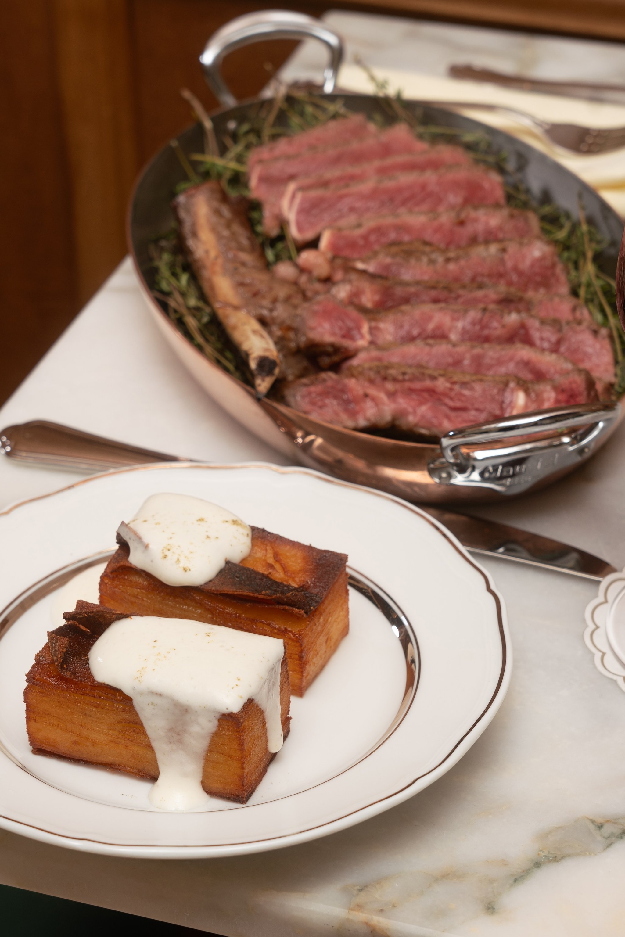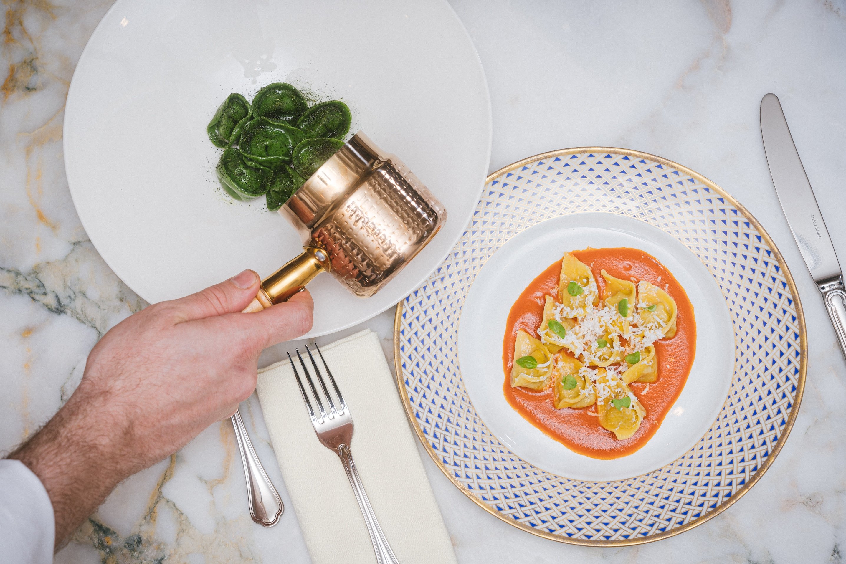 Offerings range from handmade “Tortelli alle Erbe” (buffalo ricotta and seasonal herbs filled Tortelli, leeks foam, basil oil, aceto balsamico di Modena DOP) to “Paccheri, Pomodoro, e Basilico” (homemade paccheri pasta, San Marzano sauce, basil) and a meticulously prepared “Dry-Aged Ribeye” paired with potato millefoglie.