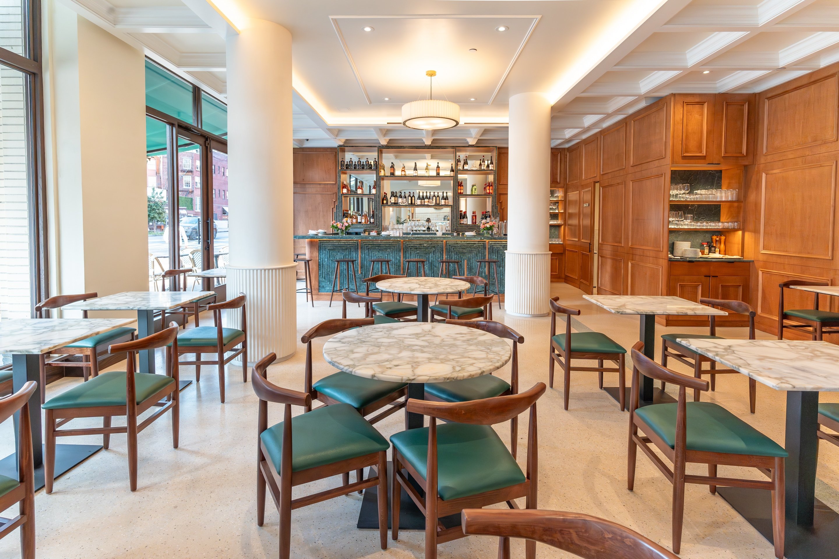 Designed by Mariotti Studio, the space’s breezy, open layout merges modern elegance with vintage charm. Interiors feature an all-marble bar inspired by New York’s Gilded Age, high ceilings, and inviting lighting that creates a welcoming ambiance reminiscent of an Italian piazza.