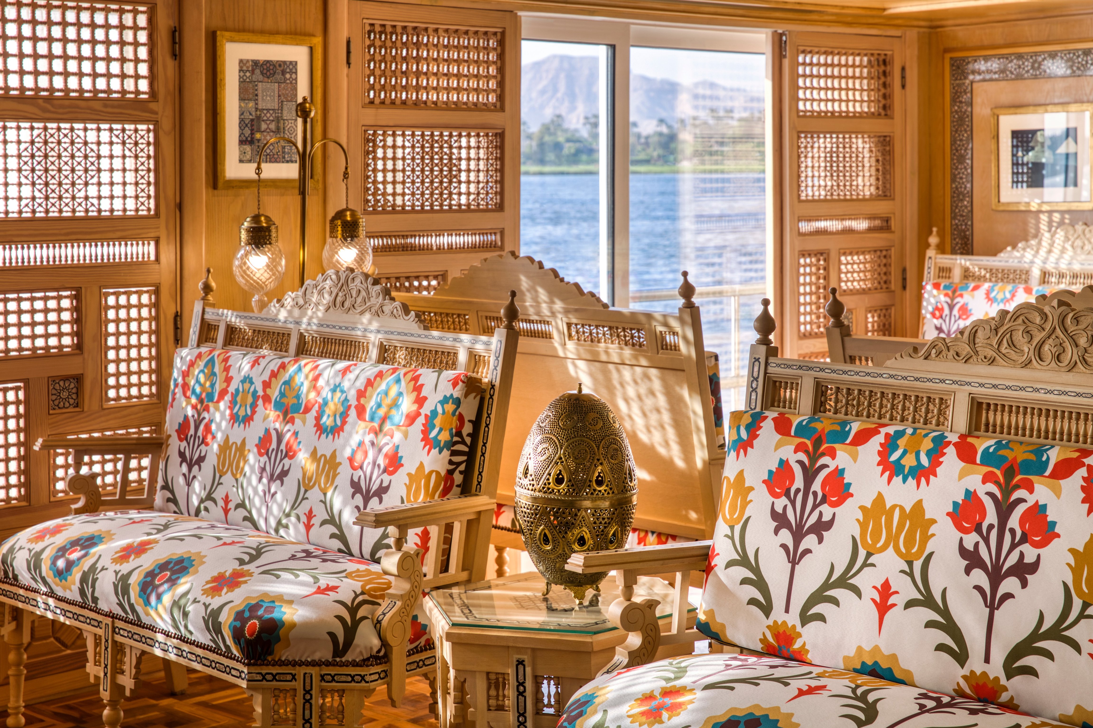 The luxurious S.S. Sphinx’s ceilings were hand-carved from locally sourced blonde wood; the geometric shapes of the Pyramids inspired the carpets; the décor was purchased in local souks and bazaars; and family-owned local furniture businesses made the furnishings. The banquettes were handcrafted and upholstered in fabric sourced from a local fabric company, and the top deck has areas protected from the sun by tented drapes inspired by ancient Egyptian. The namesake Sphinx sits at the bow of the ship, serving as the protective figurehead.