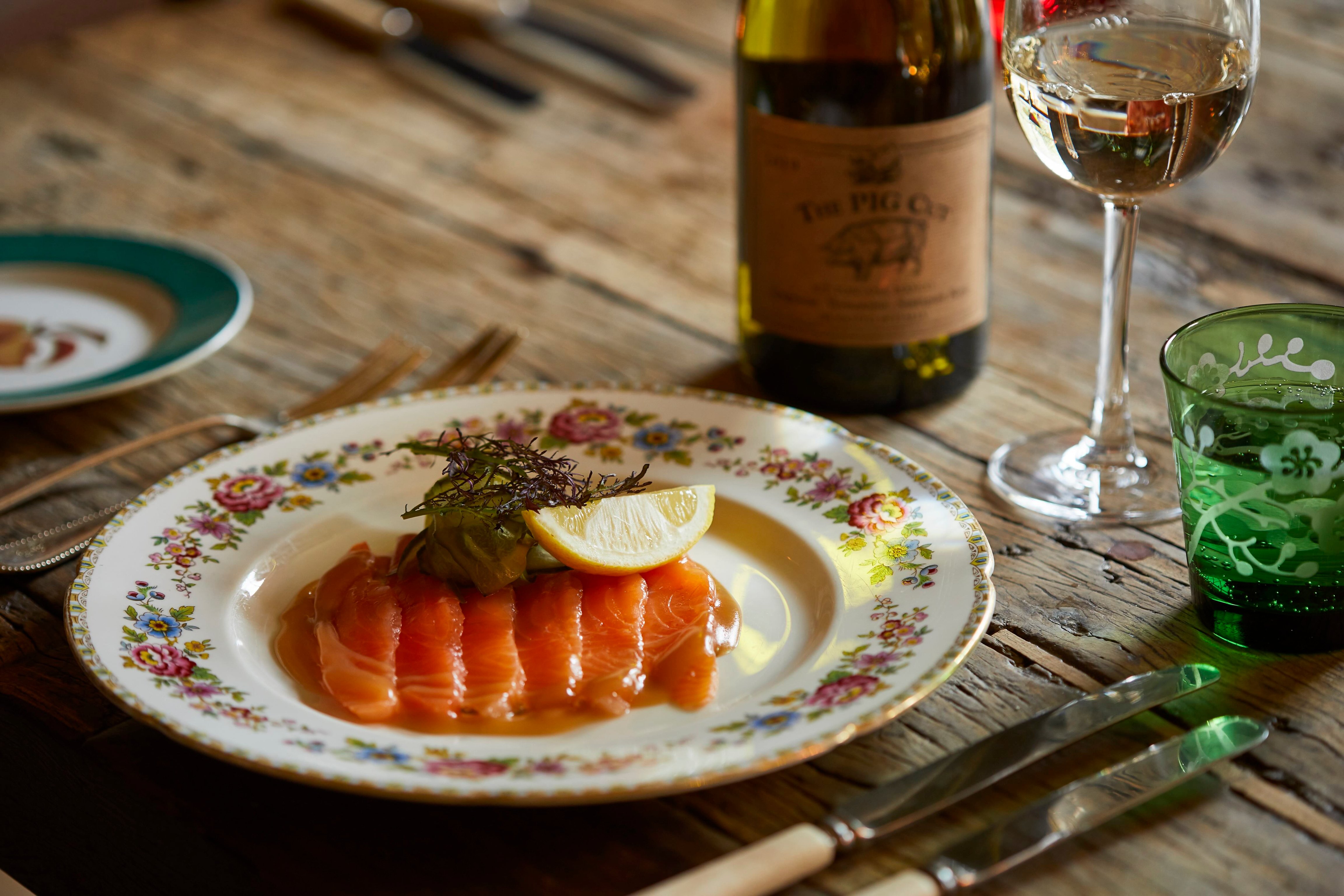At every PIG hotel, over 80% of the food is sourced from within 25-miles of the property. Menus at the Bath hotel are guided by the daily harvest of the gardens just outside. “Piggy bits” and other starters kick off the plot-to-plate experience; you can expect savory and herbaceous bites like honey and chili pork belly, winter squash hummus, and a venison carpaccio speckled with berries and Japanese mustard greens. Larger plates include a slow-cooked lamb shoulder for two, artichoke risotto, and a type of English flounder fish called plaice that comes shellacked in capers and butter. The dessert menu leans into the fruit plucked nearby, including bites of almond and gooseberry flan or a preserved blackberry cream topped with bits of hazelnut brittle. Oeniphiles should not miss the Pig’s very own wines, made from their vineyards in both West Sussex and the Kent/East Sussex border. These include the Alpaca Block Chardonnay, Alpaca Block Field Blend Rosé, and Where Eagles Fly, made from Seyval blanc vines.
