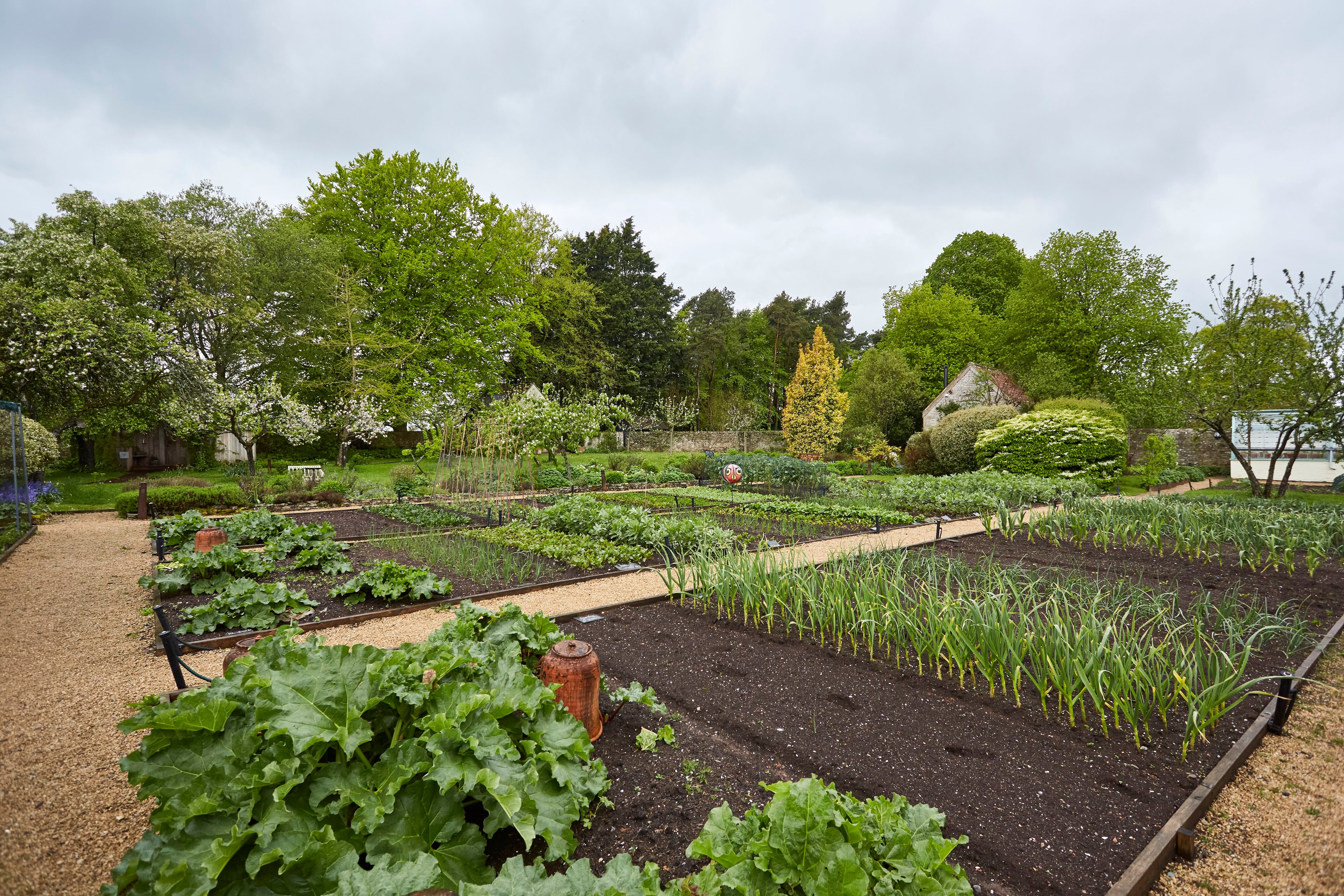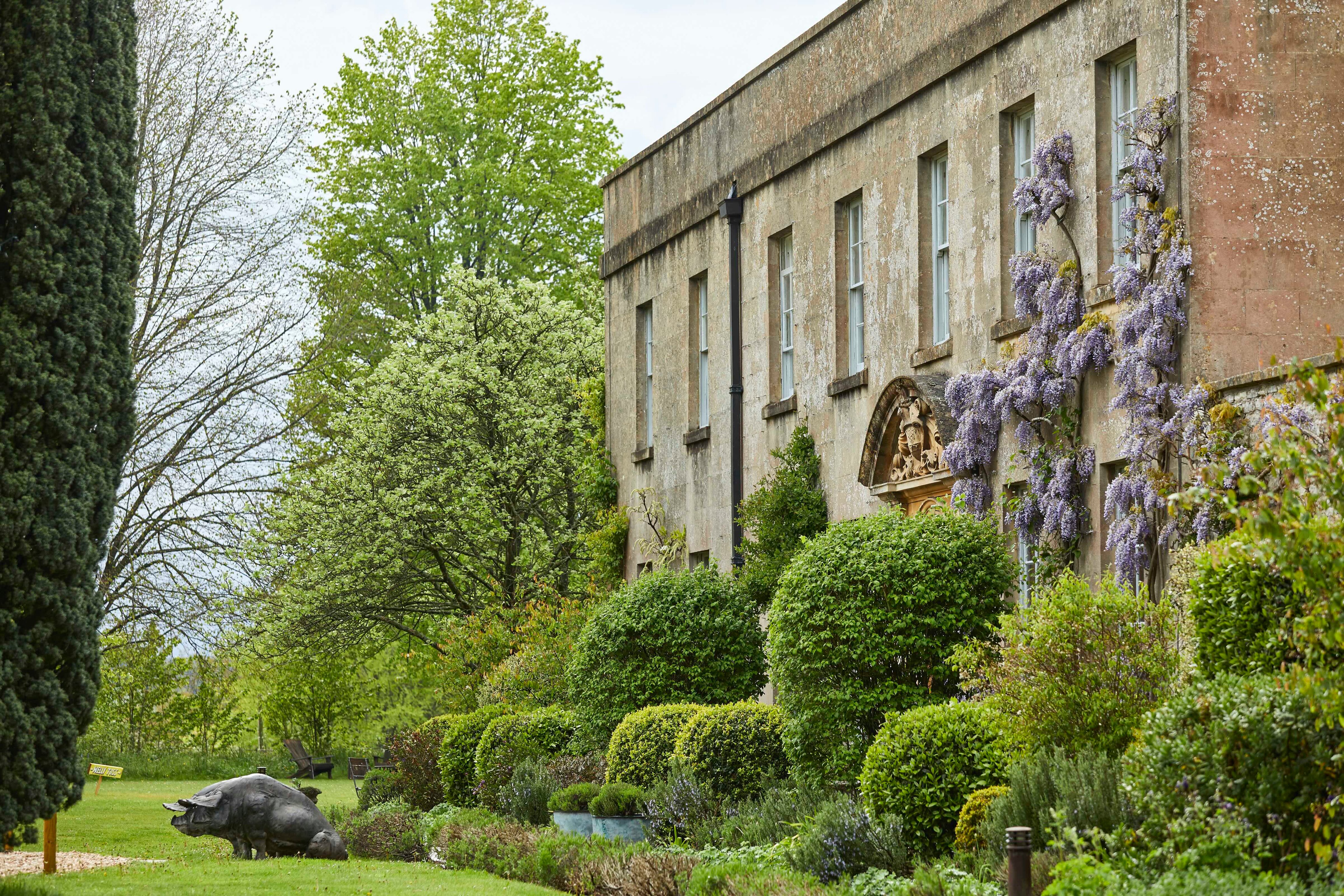 Tucked inside a honey-colored Georgian mansion with two cast-iron pigs at the entrance, a central lobby and drawing rooms are adorned in mismatched furniture, papier-mâché antlers, a cozy library with classic literature, and an intimate bar illuminated by a collection of pastel colored glasses. The hotel welcomes lounging in its quiet corners with kitschy Victorian decor and a roaring fire that crackles near sunken leather couches. Hunter wellington boots line the entrance and can be used to roam the walled kitchen garden where tours are available for guests.