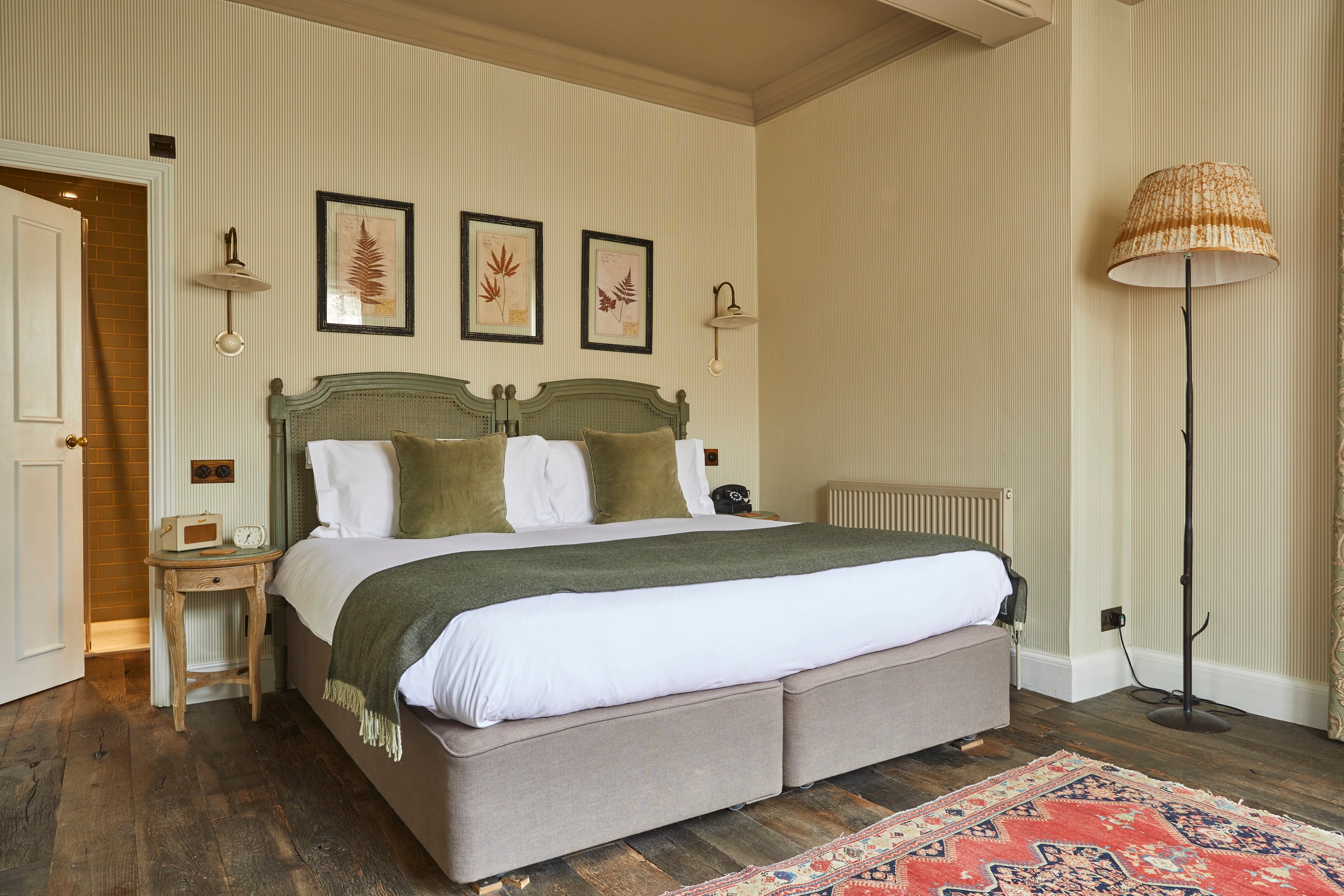 Its 31 rooms are spread about the main house, coach house, and garden. Muted tones of green and cream compliment botanical-themed wallpaper and furnishings made from reclaimed wood. Bathrooms house the sustainably-minded Bramley brand’s clary sage and lemon tinged handwash, freestanding bathtubs, and monsoon showers. Split-level cabins around the garden grounds feature wood-burning stoves and patio areas nestled near a peach orchard. Rooms in the garden also come with their own entryway with a path blanketed in foliage. Perhaps one of the most interesting boudoirs on property is the Apple Store, a provincial shed spread across two floors with a four-poster bed and log burner.