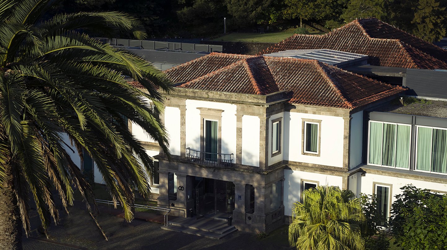 The hotel kept the distinctly Azorean style on the outside, with its crisp white-and-black facade that contrasts with the valley's verdant slopes.