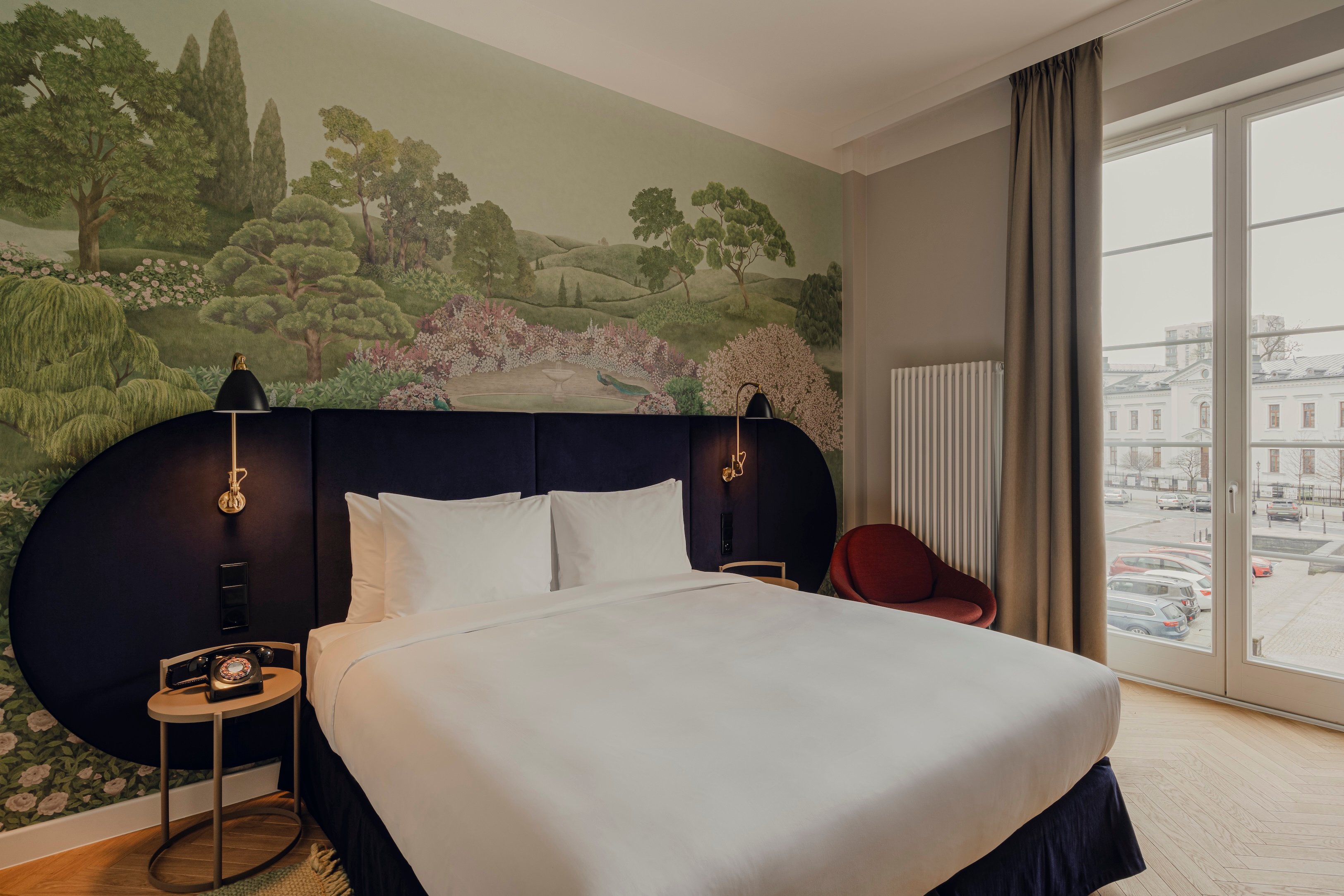 Envisioned by the Warsaw-based design studio Projekt Praga, Flaner Hotel’s interiors pull inspiration from 19th-century Parisian artistic salons and the Art Deco movement—think jewel-toned drapes, bold wallpapers, and gold-framed mirrors. Modern touches, such as Gubi chairs and Moooi rugs, are seamlessly woven in, layering timeless elegance with contemporary flair.