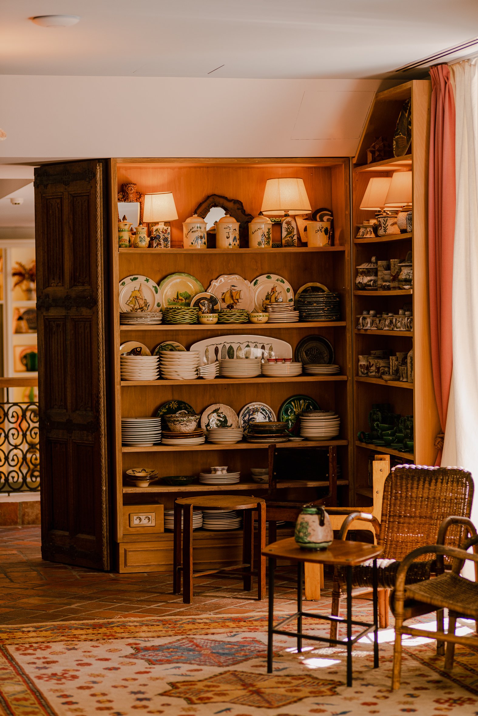 The entrance portrays less like a hotel lobby and more like a thoughtfully cluttered antique shop: Roman columns frame the doorway, while potted plants spill into the path. Inside, the front desk blends into a bohemian display of ceramics, framed sketches, Riviera paperbacks, and cubbyholes holding vintage room keys.