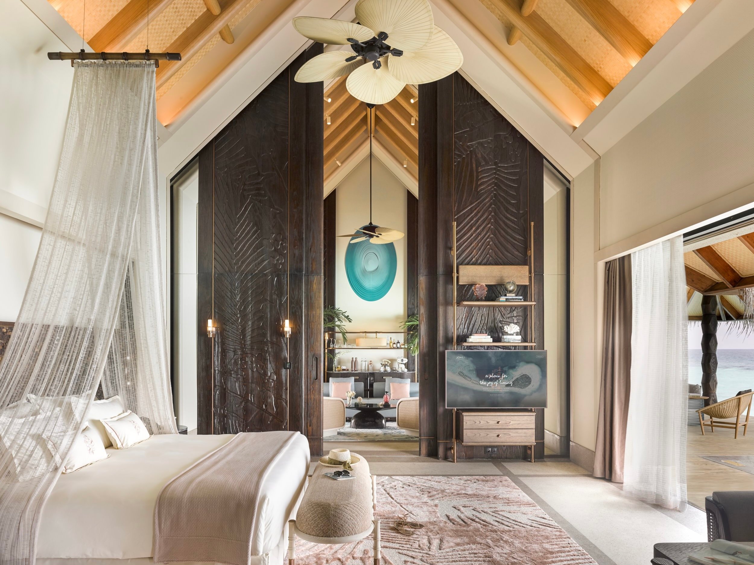 We had the pleasure of testing the water villas, which, in particular, are pure island opulence. High A-frame ceilings create a sense of grandeur, while carved dark woods balance soft creams, sandy neutrals, and subtle pops of peach and teal. A separate living area includes a fully stocked bar, espresso machine, and tea service, while the canopy king bed faces the ocean through sliding glass doors.