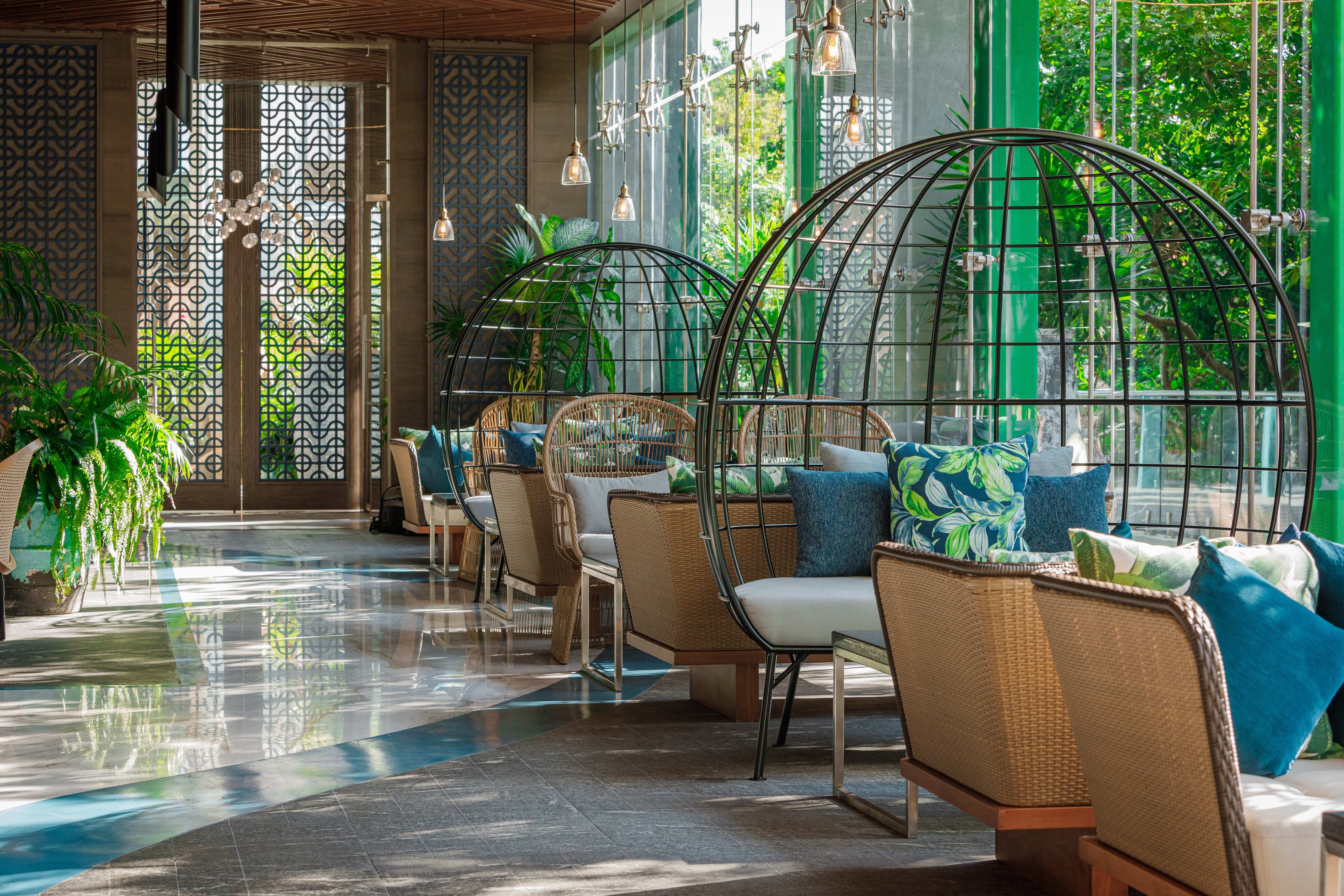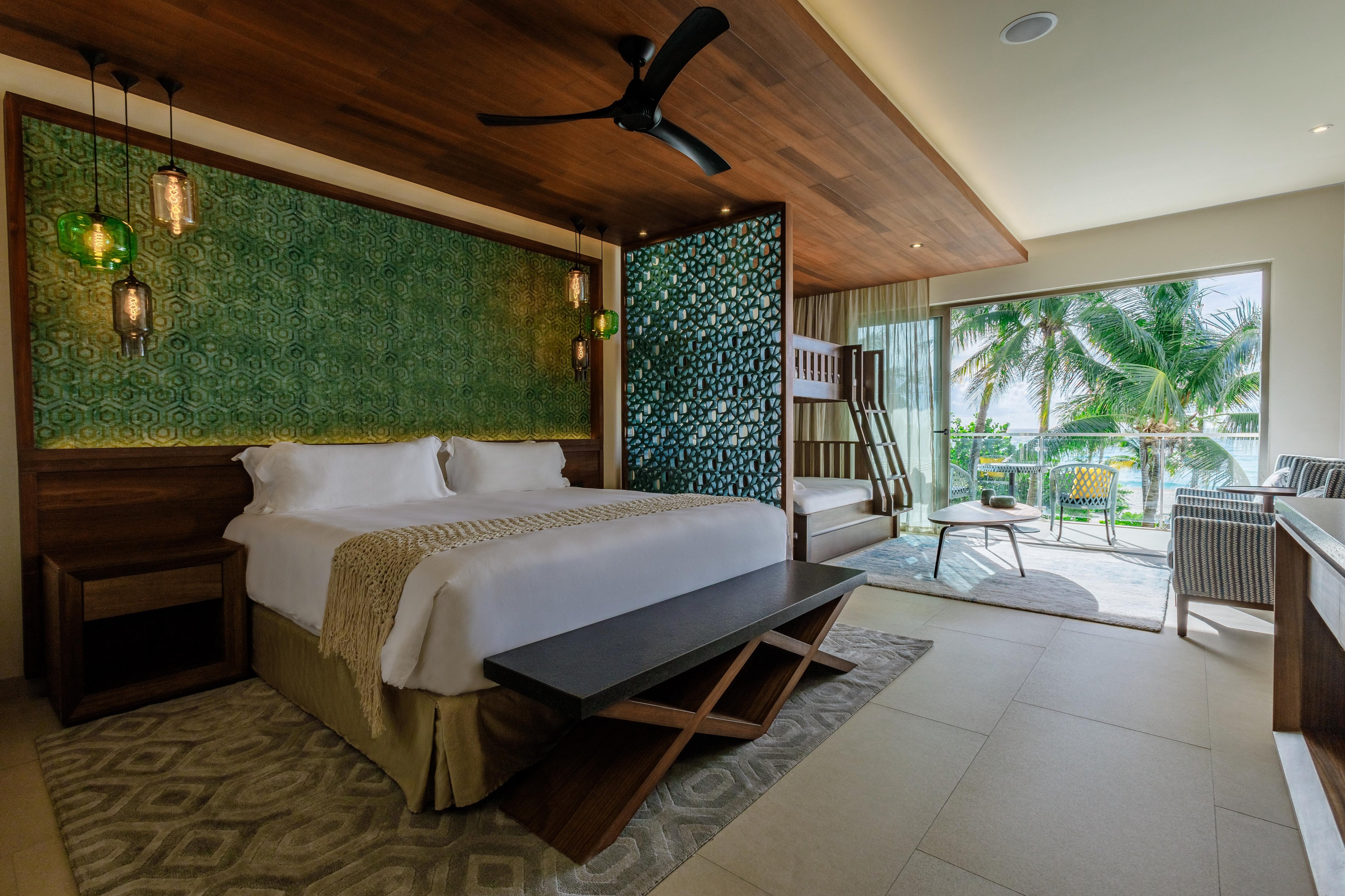There are 234 suite-style rooms in total, all of which maintain a similar style and layout. The spacious bathroom features a sleek white soaking tub opposite a walk-in rainshower and a double sink station. There is a modern bohemian aesthetic, emphasized with hand-woven textiles, knitted blankets and ocean-inspired hues. In the closet, guests will find a complimentary mini fridge filled with gut-healthy kombucha, mineral water and some of the best coconut water you’ll ever have. Though the higher level rooms boast sweeping ocean views from the balcony, those who stay on the first floor can score swimout rooms that lead directly to the pool, allowing you to enjoy and early morning dip or hit the swim-up bar at your leisure.