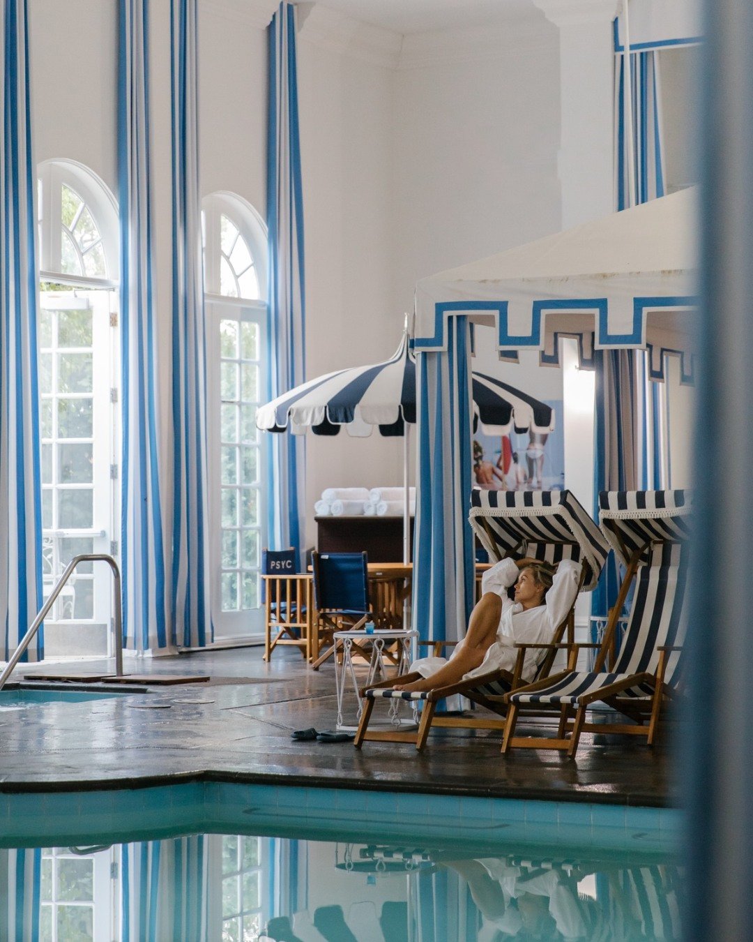 Amenities: A co-ed relaxation lounge with an indoor swimming pool, two hot tubs, and multiple striped deck chairs; well-appointed locker rooms with eucalyptus steam rooms and saunas.