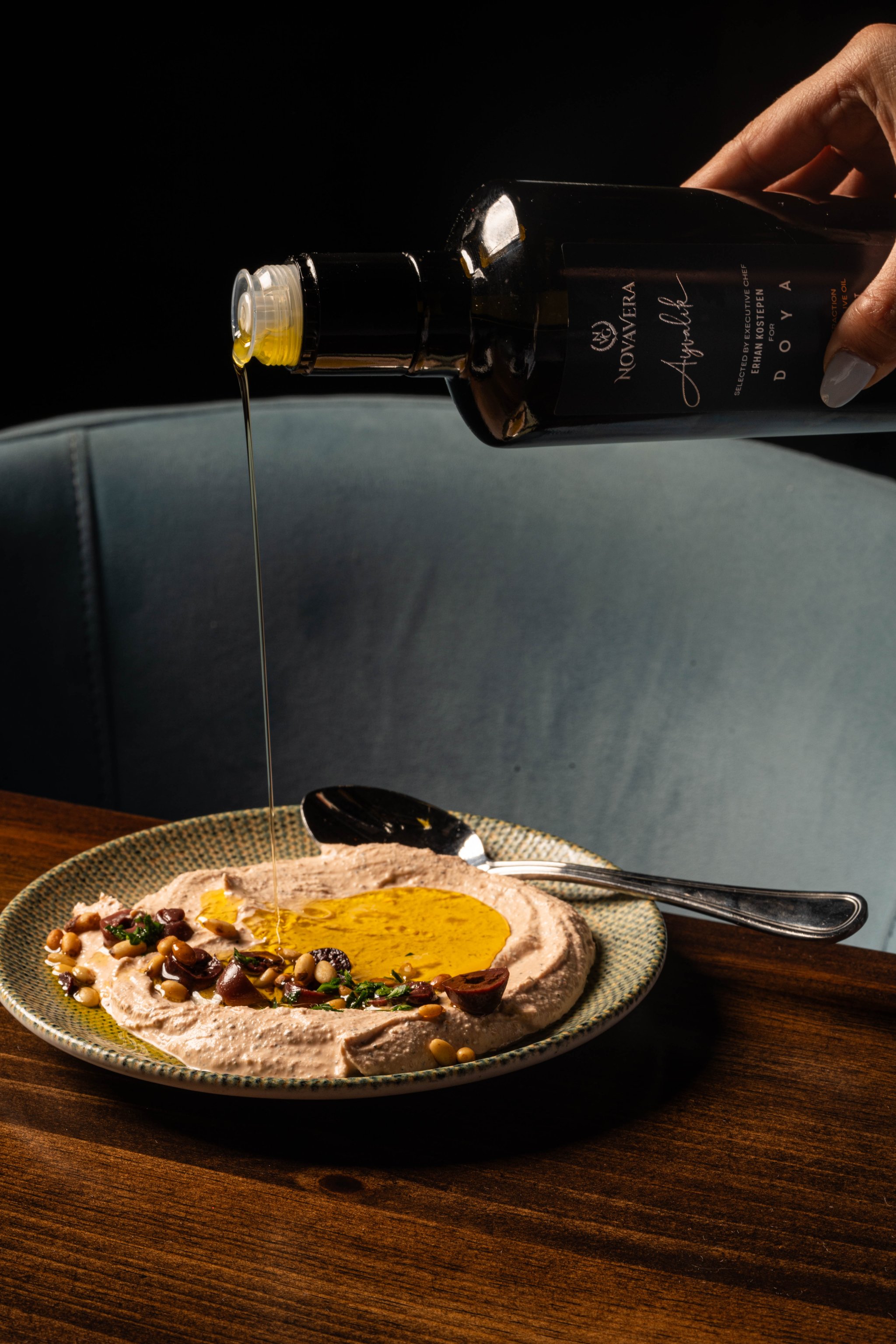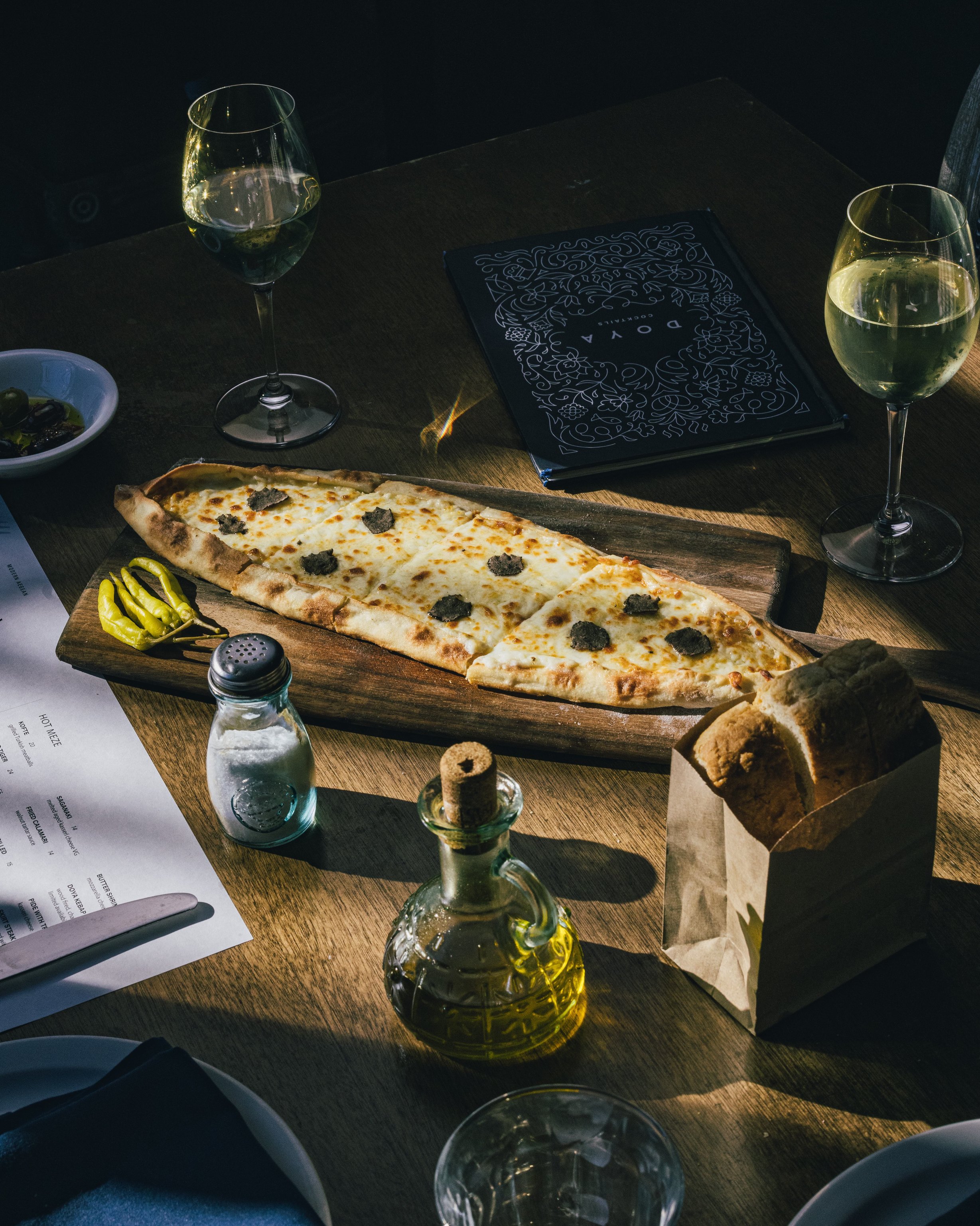 The all-day menu is categorized into cold and hot meze, designed to be shared—or not, if something really catches your eye. Spreads are a great start, including garlicky haydari, roasted eggplant, Cretan feta and tzatziki with mastic, an aromatic resin sourced from a Greek tree. Be sure to save some of those puffy pitas to dip into Doya’s proprietary olive oil, procured from a top producer in Ayvalik, Turkey. A platter of pickled vegetables—also from Turkey—makes for a tangy palate cleanser. Tender slices of branzino ceviche are tossed with mustard, red onions and peppers and topped with a generous sprinkle of dill; “cooking” the fish in citrus gives each bite a satisfying firmness.