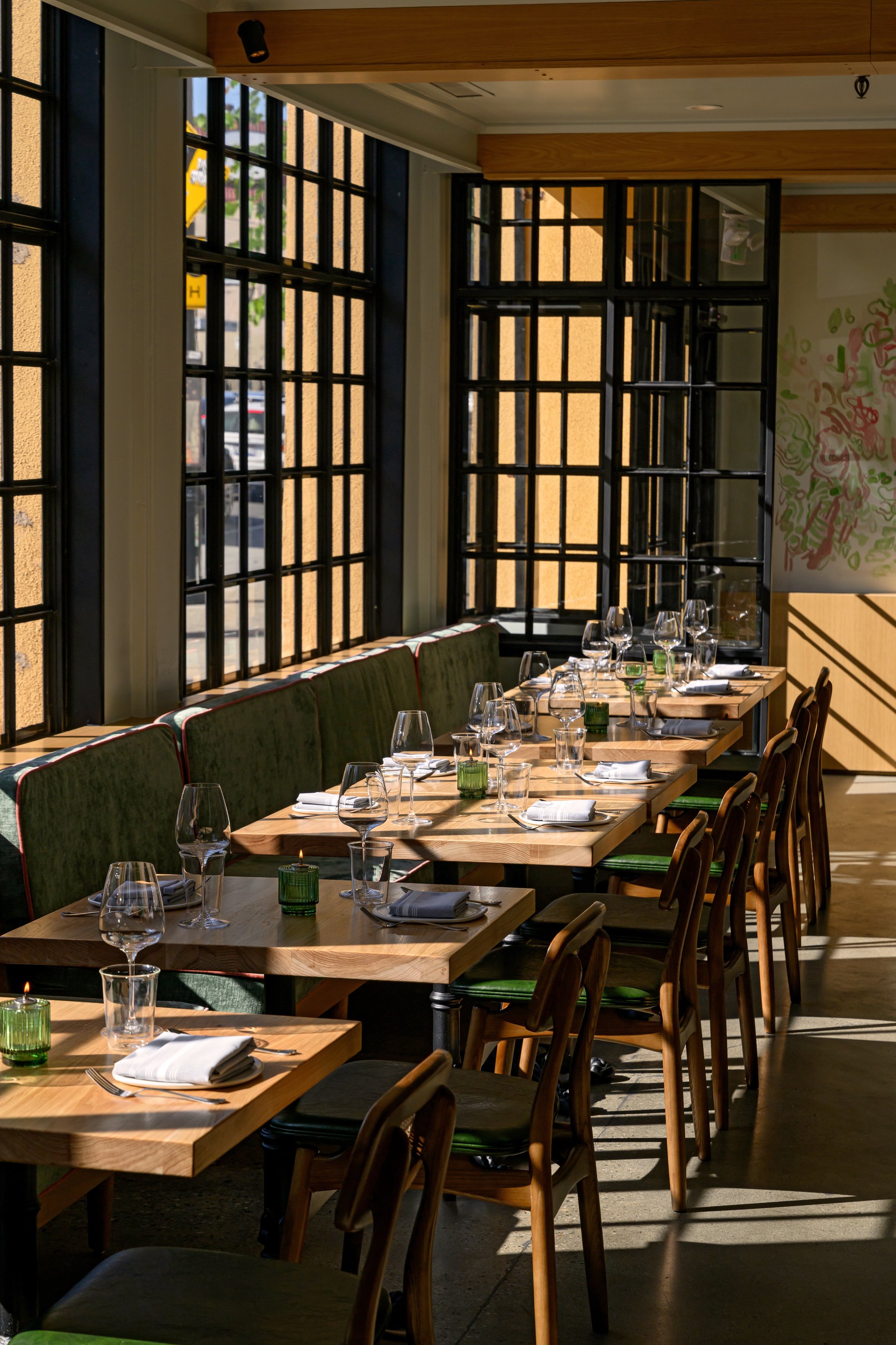 Just past a courtyard in Chinatown’s Mandarin Plaza, Firstborn sits in an unassuming corner that buzzes with life as soon as you enter its doors. Red hues from the building across the street cast a subtle electricity to the space, decked out in emerald tile archways and a Beijing-inspired grid-style window that leads to a spacious kitchen. Here, Chef Anthony Wang (formerly of Ink, Auburn, Destroyer) pays homage to his Chinese American upbringing with food that influenced the way he grew up as the first U.S. born member of his family. L-shaped banquettes in a lounge area and jade colored tiles at the bar evoke the mood of both Shanghai and a classic French bistro. Drawing creative inspiration from his mother and sister, Wang decided on intimate nooks and corners for more intimate dining options alongside rows of oak white tables. Diners here are lively, and the convivial atmosphere pairs well with the family style dishes that Wang and his team hope tell a story of migration, innovation, and what a promising future and storied past Chinese cuisine has on American soil.