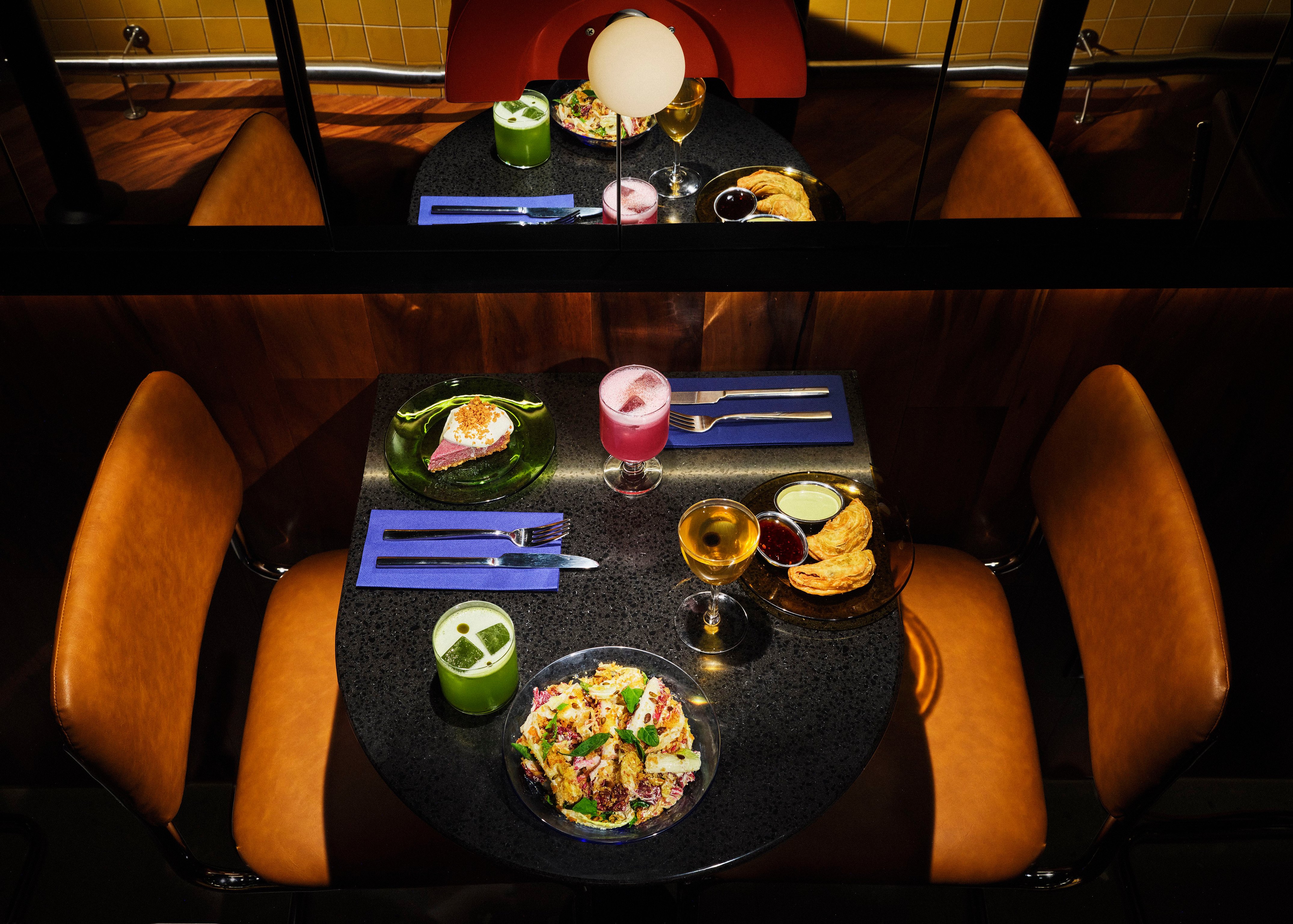 Finish strong with “Explorative” cocktails like Infinite Loop, a globe-trotting take on a Vesper Martini layered with sesame- and hazelnut-infused gin, guava, whey brandy, and white aperitif.