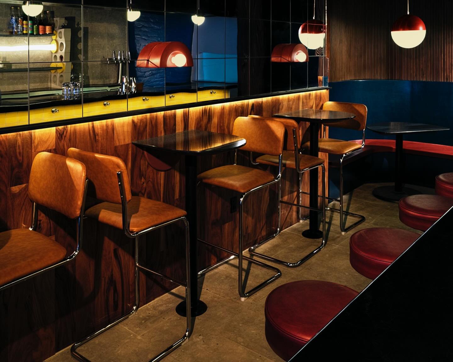 Stainless steel elements sharpen the space, while unapologetic pops of banana yellow keep things buoyant and bright. It’s retro and immersive without trying too hard–exactly the kind of environment that invites curiosity before guests even open the menu.