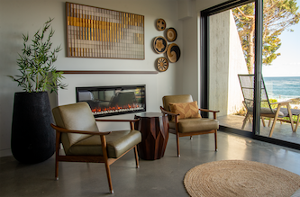 In contrast to the eleven beach cottage chic boutique suites that sit behind them on the hilltop, the king-sized shoreside rooms are sleek and sexy (almost like something out of a Bond movie), with tech features like electric fireplaces and Samsung Frame TVs and decor that bring the outdoors in. There are custom woven headboards fitted with planters and a different bedside chrome bird lamp in each room, a nod to the 20+ avian species living on the property.