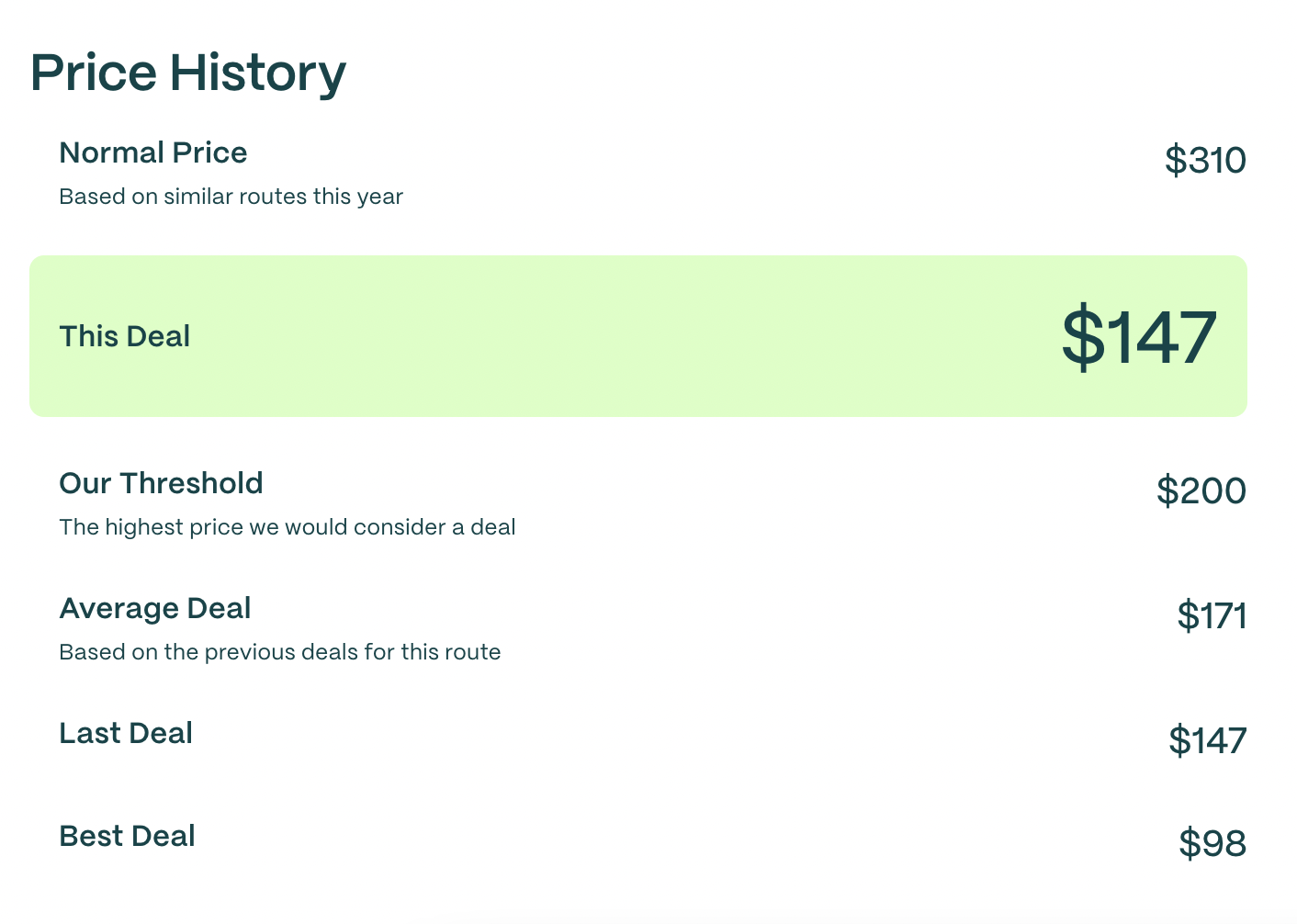 The second is a bit more obvious: the discounts are actually good, and they’re sourced by real humans. Each listing is presented with a comprehensive breakdown that lists normal price, average deal, and a note on Going’s threshold for what they wouldn’t consider a deal for the same route. It even includes the plane model and accompanying legroom.