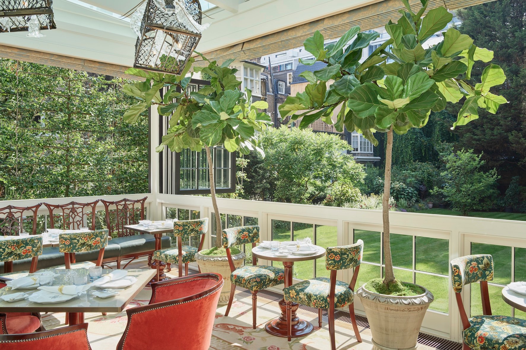 The experience is set on The Veranda, whose architecture and design were led by the inimitable Russell Safe. This glass-encapsulated pavilion intrinsically links the serene Goring Gardens, one of the most extensive private gardens in the city, with the uplifting and eccentric interiors. Antique furniture swathed in sumptuous textiles and white tablecloths topped with poppy yellow and gold-flecked china are juxtaposed with bright, beachy paintings and glass lobsters suspended in the air within metal traps.