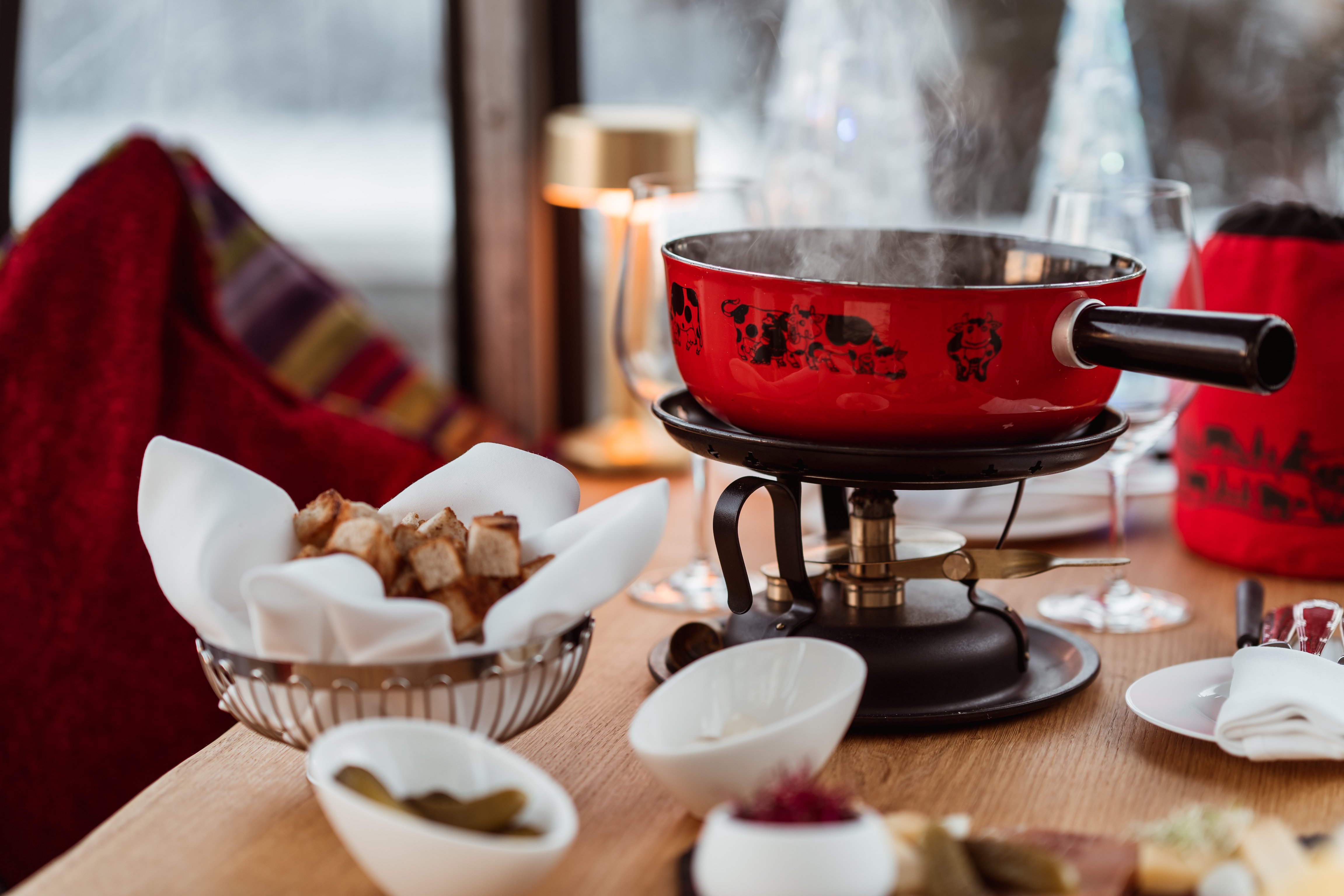 Just below the sweeping terrace on the ground floor stand several cozy gondolas adorned with fuzzy blankets and a wooden tablescape where guests can enjoy traditional Swiss cheese fondue.