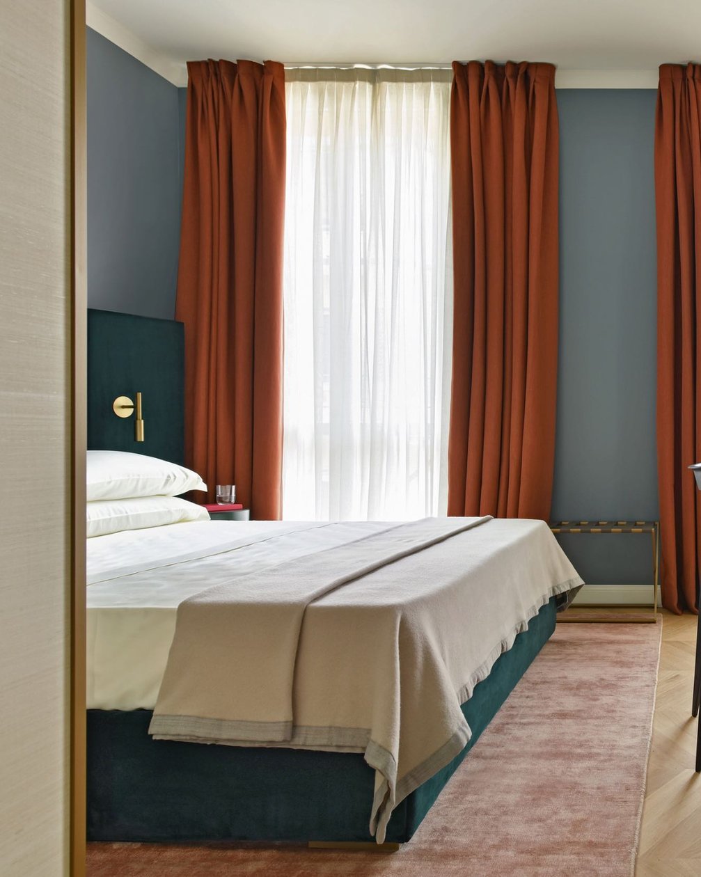 Guest rooms feel more like a “curated residence” than a hotel key card. Think moody palettes, soaring ceilings, custom Cassina pieces, and terrazzo-tiled baths that double as design statements. The silk-lined wardrobe in Suite No. 5 nods to Milan’s couture DNA, while the Corner Suite charms with views over Via Olmetto and Via Cornaggia. Even the smaller categories manage to deliver Milanese sophistication with a lived-in warmth that feels personal, not perfunctory.