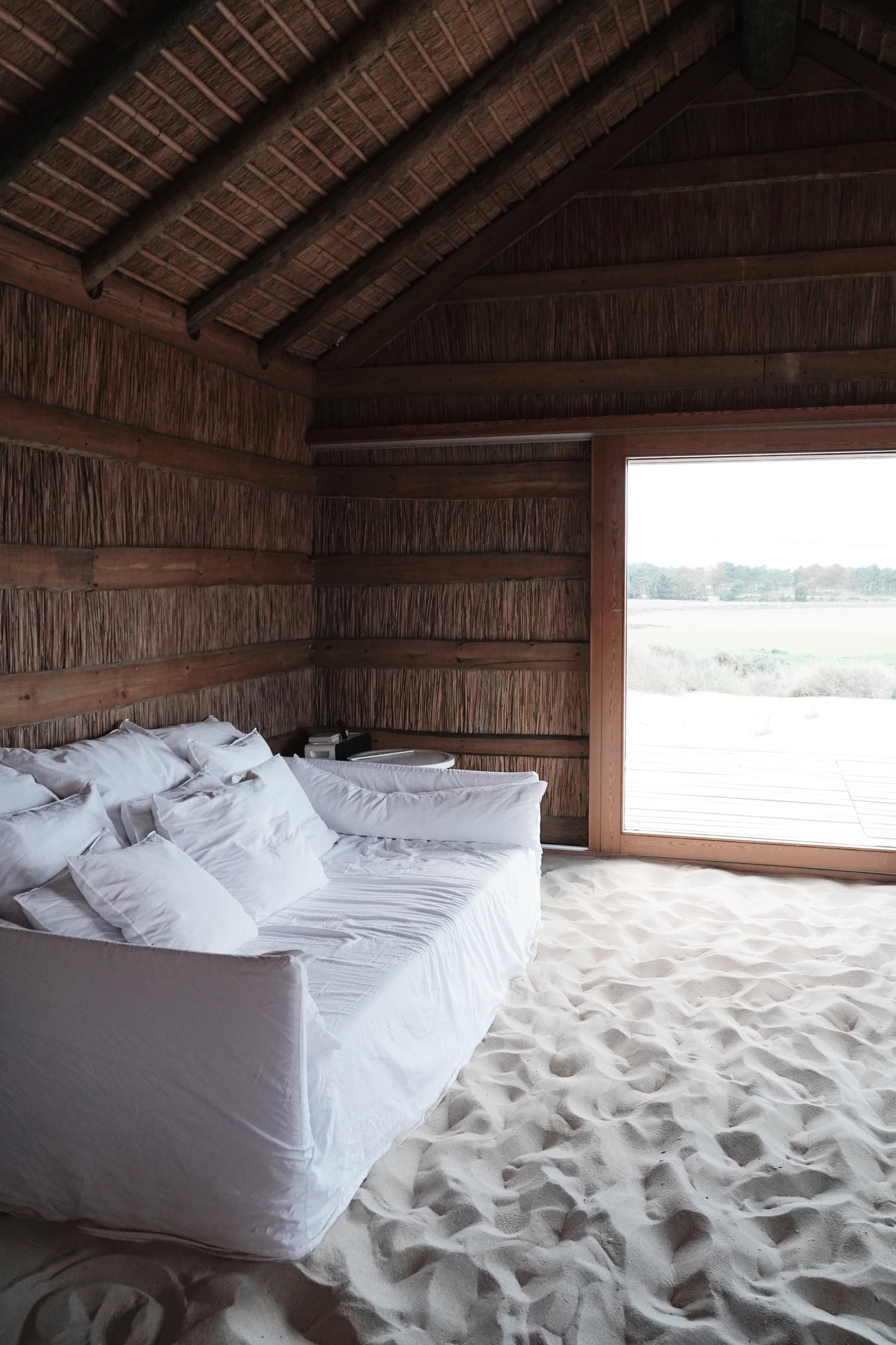 Nestled in the Sado River Nature Reserve, the setting is stunning, surrounded by rice paddies and pine forests. However, you’re only ten minutes from the beach; the property looks out towards an expanse of green fields and wild, bushy shrubs, feeling cocooned in this private complex of four huts, each connected by a wooden path. The heart and soul of Casas Na Areia is the living/dining and kitchen area, paved with grains of sand (heated in winter), complete with cozy Gervasoni linen sofas and a long wooden table which you’ll find set up with a delicious breakfast spread every morning.