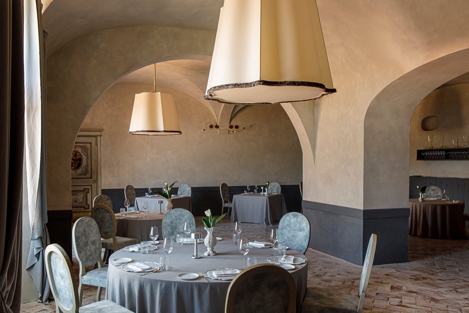 Milanese designer Paola Navone was recruited to reimagine the castle interiors. The result is a delicate dialogue between historical architecture and present-day comforts. White terracotta floors, vaulted ceilings, and centuries-old frescoes complement cool-toned furnishings, soft textures, and subtle modernist touches. An abundance of natural light illuminates centuries-old details. Each space feels grand yet quite intimate.
