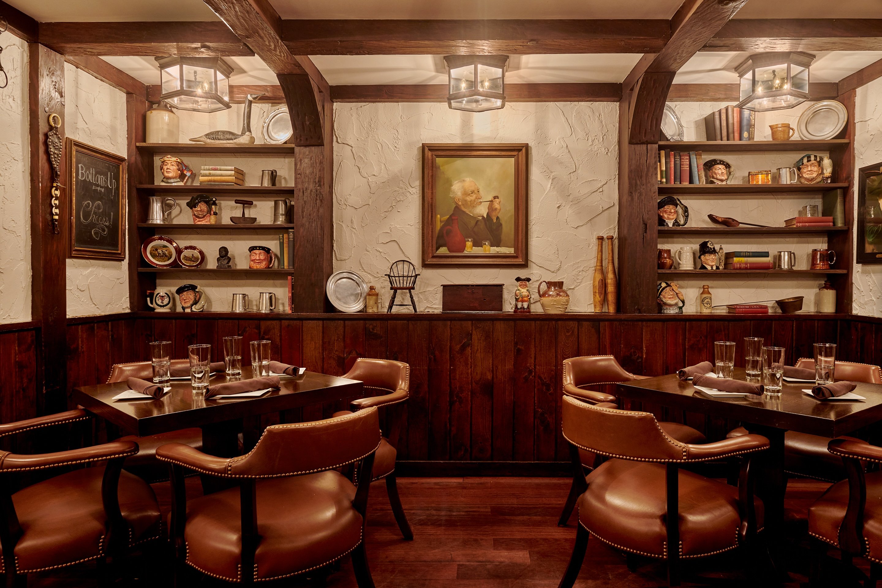 The current Deer Path Inn was built in 1929 and the interior was fully renovated in 2016. The renovators took care to retain the hotel’s original English countryside aesthetic. Tudor-style beams thread from the exterior inside. Diamond lattice windows and doors and hanging iron candelabras complete the hotel’s immersive English treatment.
