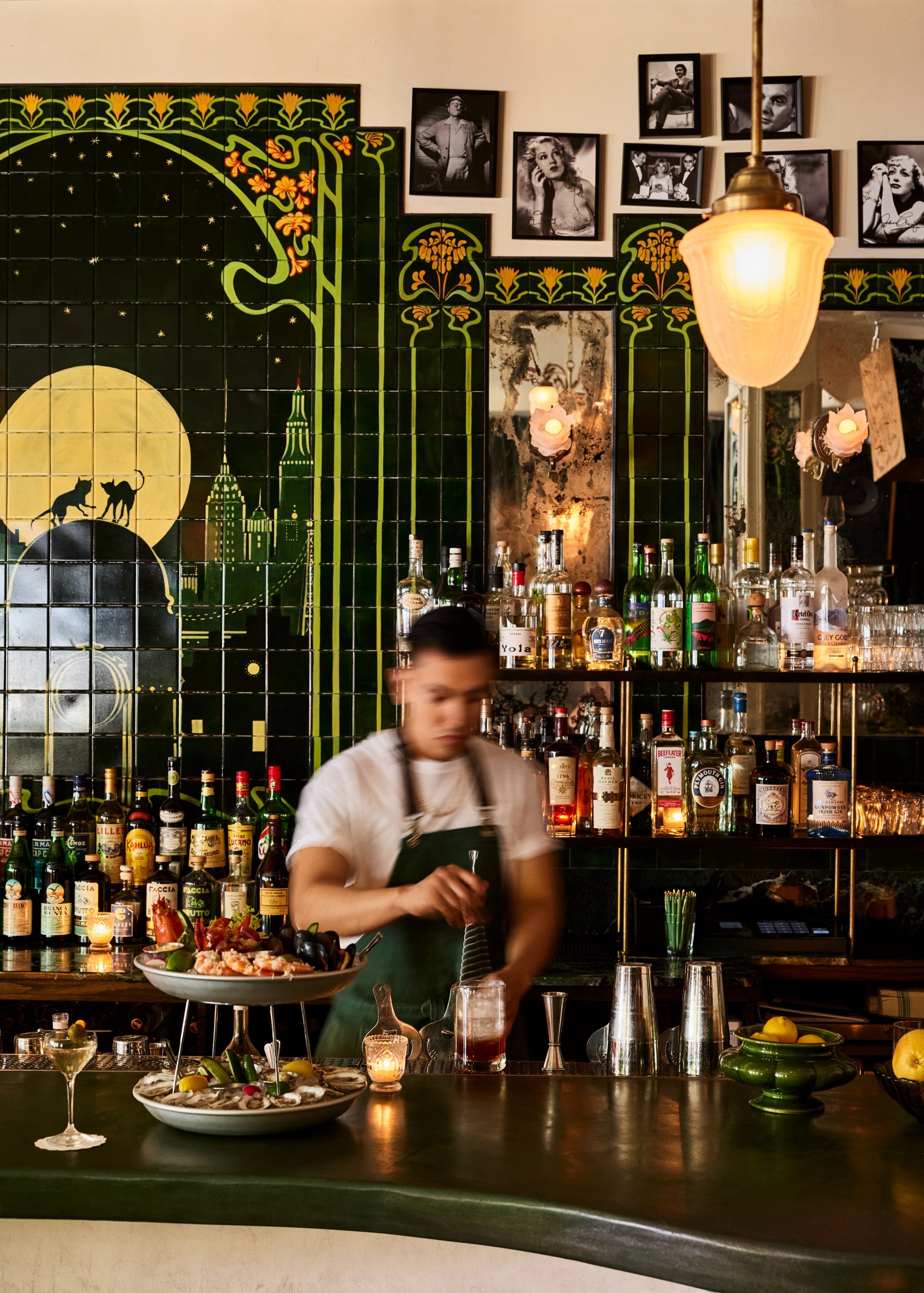At the heart of the room is a handpainted tiled mural depicting two cats playing under a full moon, framed by the Williamsburg Bridge, and twinkling lights of the Empire State Building and Manhattan’s cityscape. A curated mix of old rock tunes fills the air, while ambient lighting and candlelit cocktail tables set a moody tone.