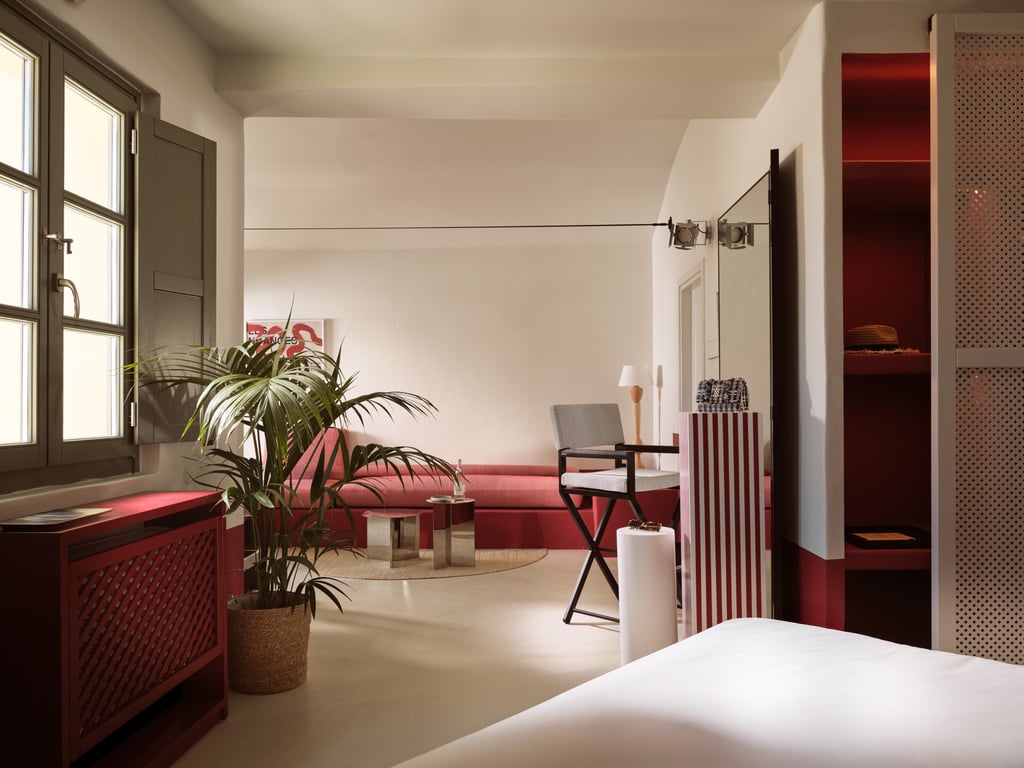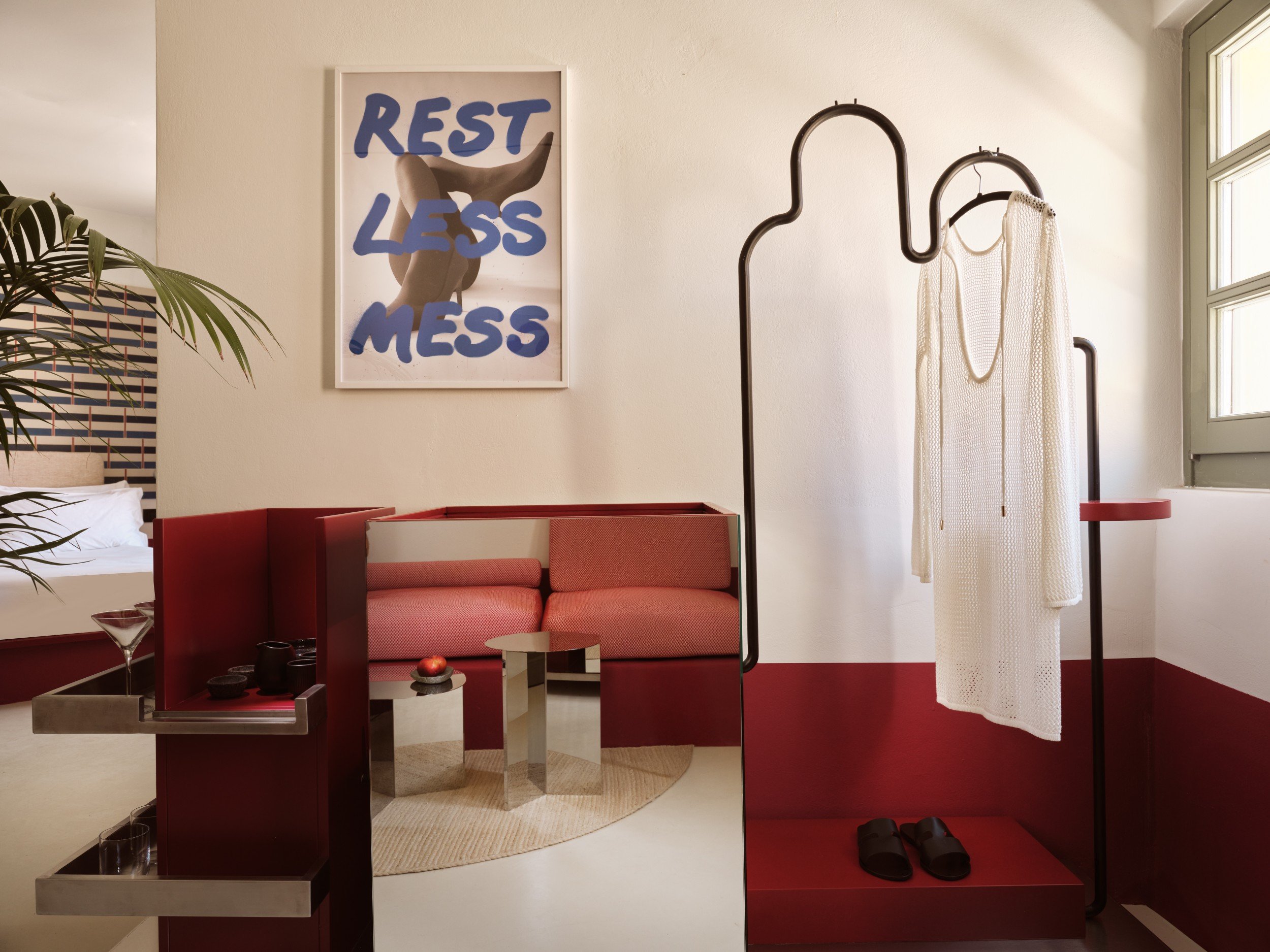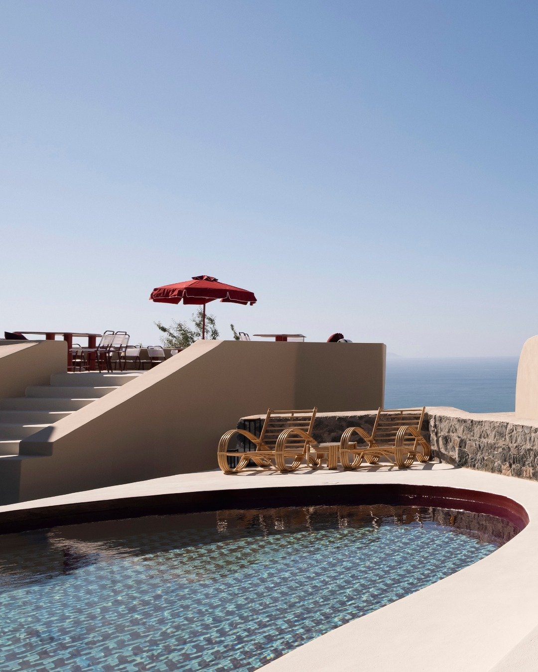 Conceived by the acclaimed Urban Soul Project, Neema Maison feels more like a fashion atelier’s vacation house than a hotel. Interiors fuse traditional Cycladic elegance with playful modern touches–think whitewashed curves, statement red accents, and curated clothing ensemble displays that nod to its namesake, “Neema,” meaning “thread” in ancient Greek. Inspired by the myth of Ariadne, who gifted Theseus a thread to find his way out of the labyrinth, the hotel’s design follows a similar metaphor–guiding guests through a journey of exploration, creativity, and quiet luxury. The visual narrative is bold yet understated, with textures, lighting, and sculptural furniture all echoing the themes of movement, craftsmanship, and artistic expression.