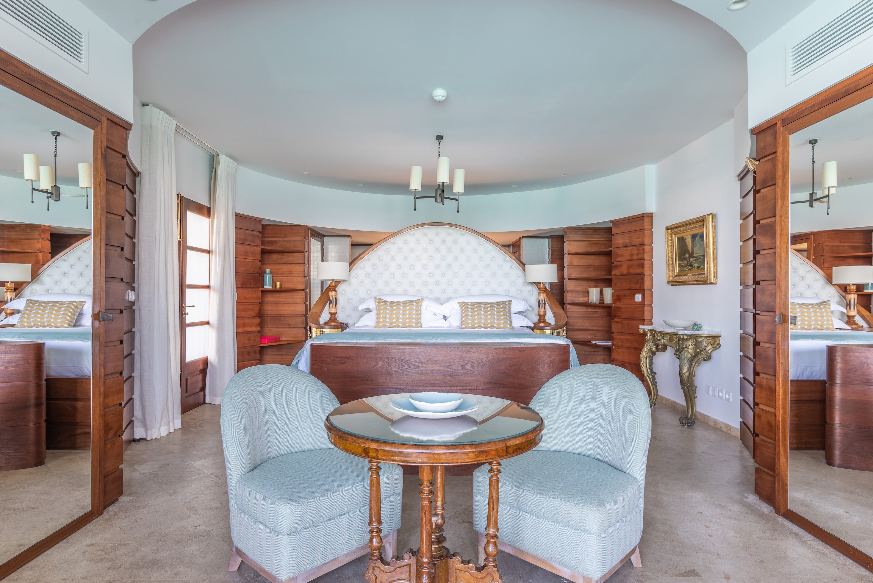 Other accents such as rattan headboards, pottery, and woven baskets reinforce the sense of place. Bathrooms are stocked with Dr. Barbara Sturm products, plush robes, and Eden Rock red nail polish. Turndown amenities continue the theme of anticipating every need. You might return at the end of the evening to find a branded wet bag with a note encouraging a last-minute dip in the sea or a leather passport case as a fond reminder of a memorable stay. Some accommodations have outdoor patios with plunge pools, loungers, and sofas. The lull of the waves is a blissful soundtrack.