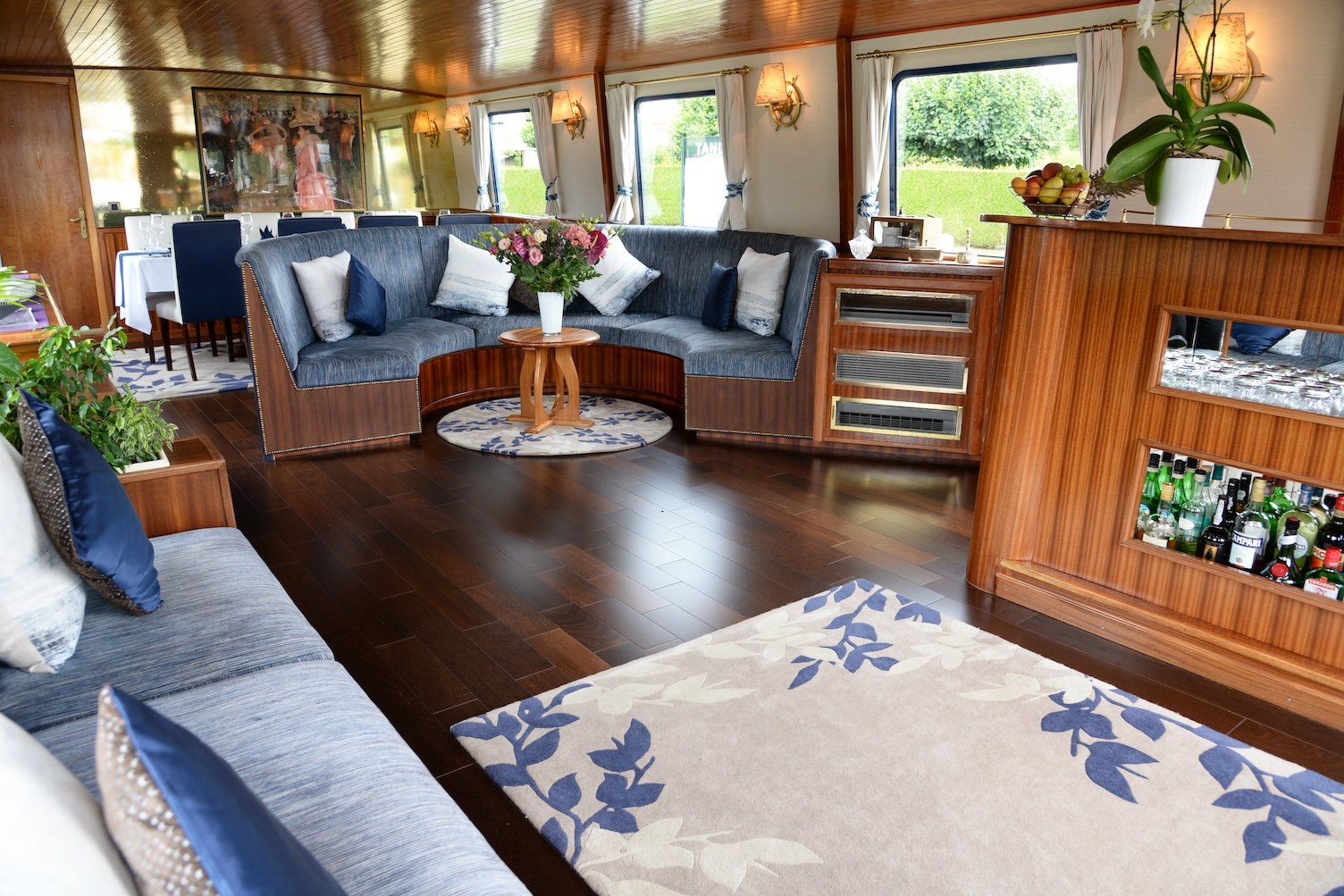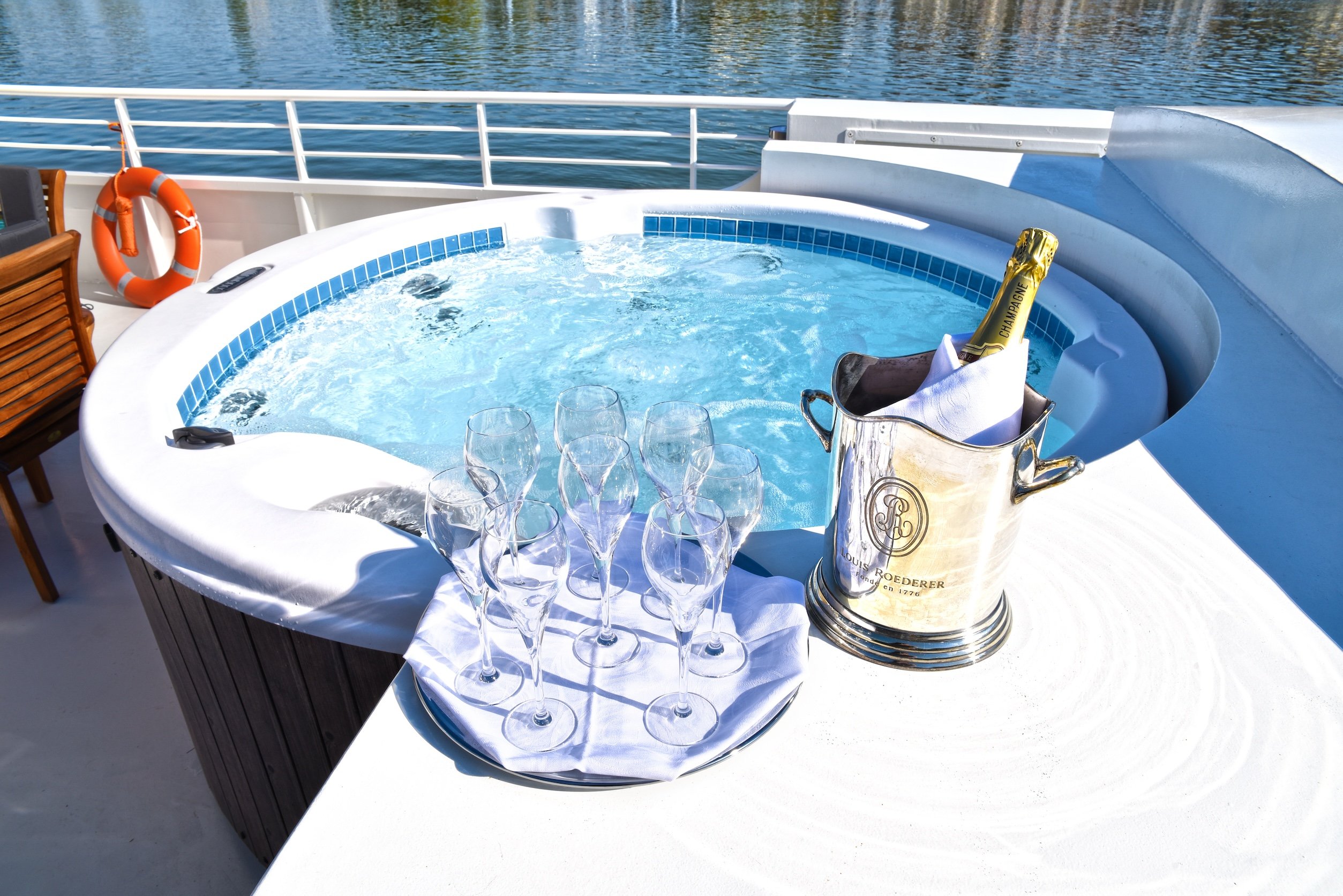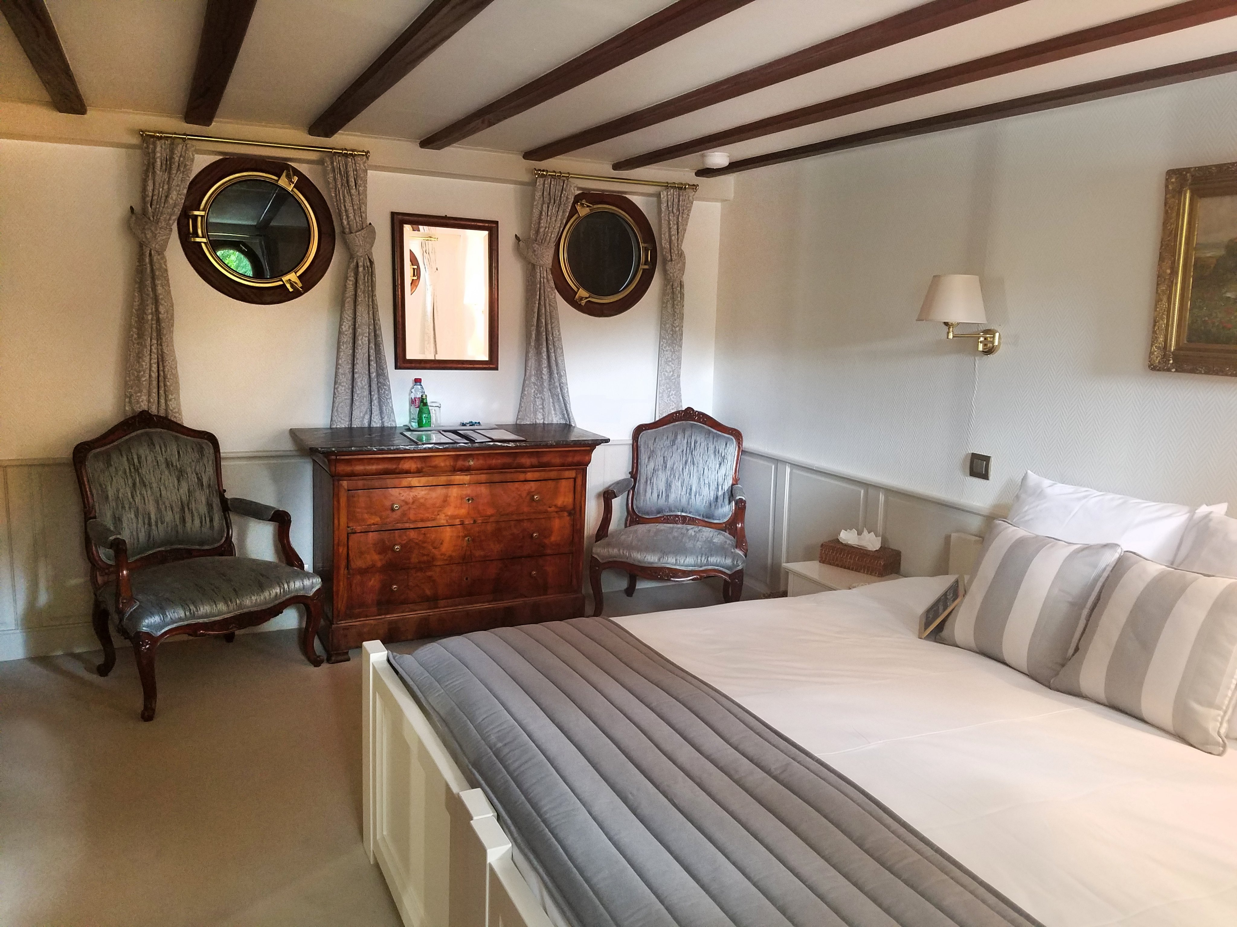 I loved that Enchanté, like most European Waterways barges, has plenty of outdoor space on its shaded sun deck to relax with coffee, a book or a glass of wine. There’s also a six-person hot tub. Inside, the comfy, French-coastal inspired living room and dining area is fully air-conditioned or heated depending on the season, with large panoramic windows that drench the space with sunlight. There’s a small library with books, games, binoculars, and maps, along with umbrellas. Wifi is available, although depending on where the barge is sailing, I found that service can be spotty at times.