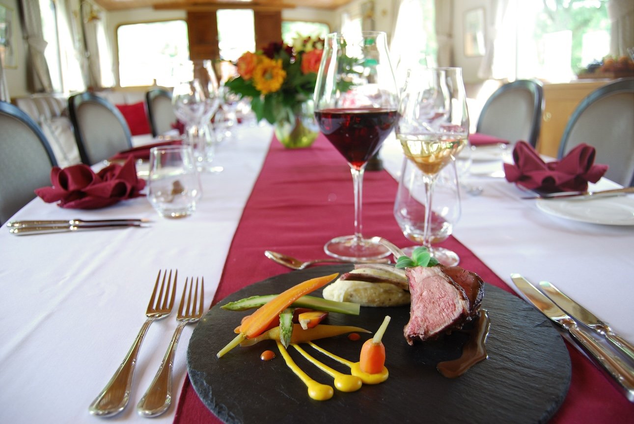 For breakfast, we ate (too many!) fresh-baked pastries and breads, eggs on request, plus an assortment of fruit, yogurt, granola, and freshly squeezed orange juice. Lunch typically included soup or salad, a regional dish, and a dessert or cheese course – often served al fresco on the sun deck. Dinner is more formal, with local cuisine by candlelight. Fine regional wines accompany lunch and dinner.