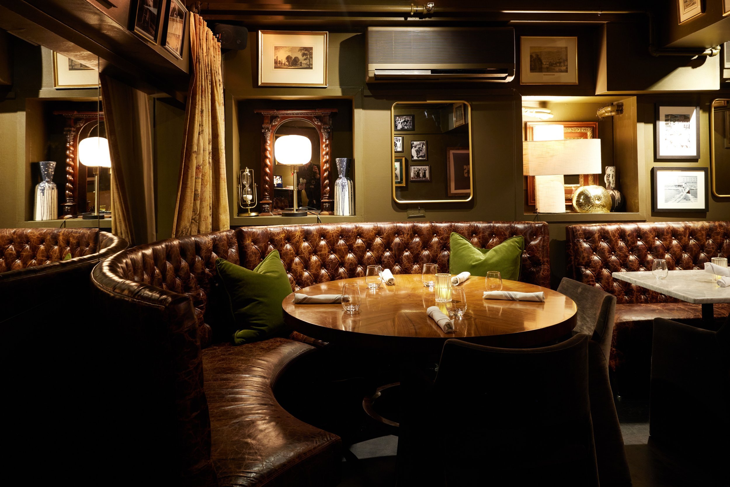 The whimsical space features rattan light fixtures and plant holders, tropical flora, and a marble-topped 12-seat bar with a scalloped design evoking the scales of a mermaid’s tale. Antique furnishings were sourced from Leonard’s as well as Jenkins’ own collection. Once seated along the perfectly worn leather banquette that lines the room, guests may continue to uncover the bobs and bits perched along every ledge, such as Black Forest carved-walnut trophies and a historic sign from the Oak Room at the Fairmont Copley Plaza.
