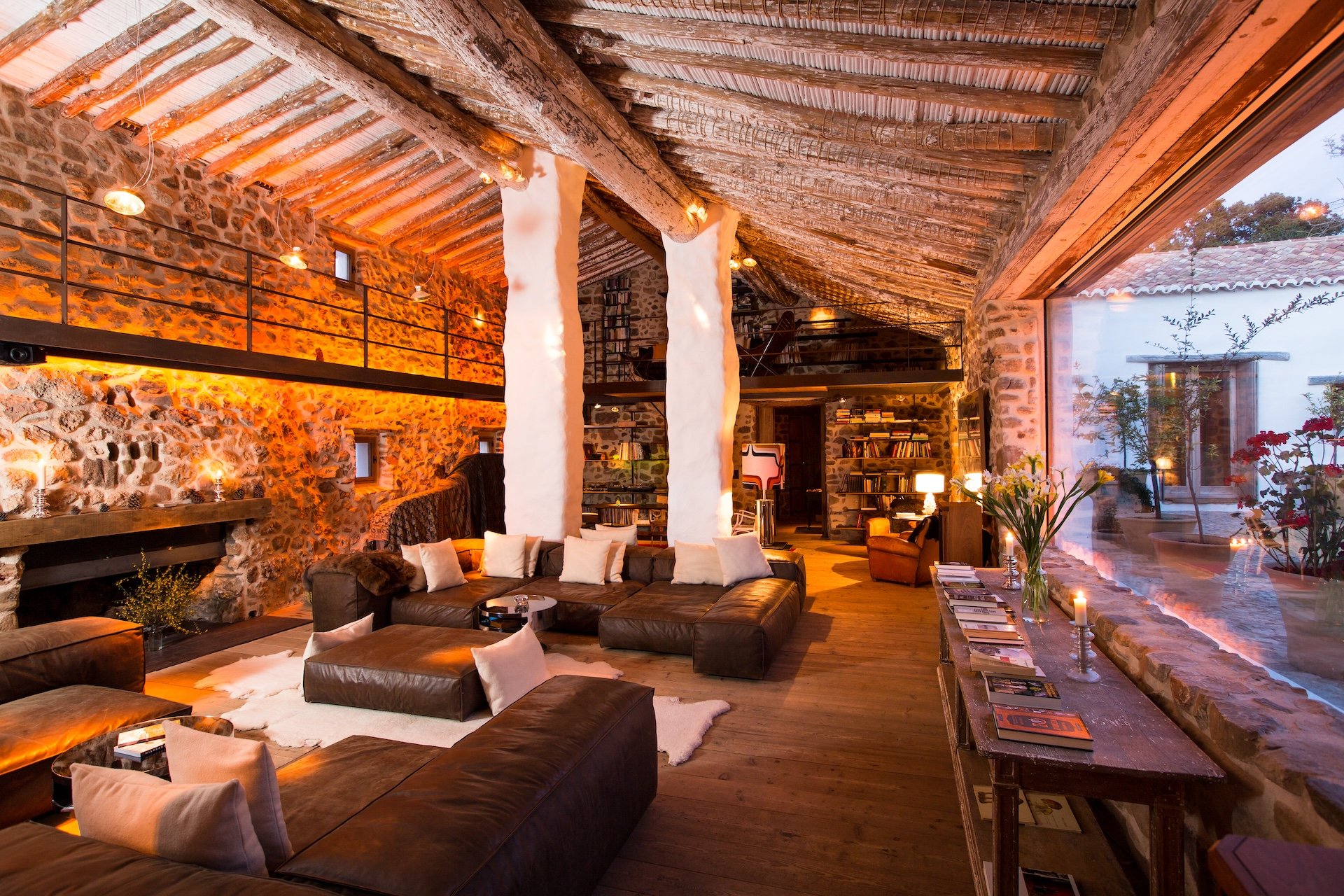 The property began as cow and horse sheds before an Austrian tech entrepreneur acquired it in 2005, spending six years transforming it under sustainable design principles. Traditional adobe and lime plaster coat the walls, while natural wood, rocks, and boulders are incorporated throughout. The result is a carefully curated tableau of contemporary art, vintage furniture, and found objects – antiques beside vases of wildflowers; old record players and photography books on handcrafted tables; stone, metal, leather, and weathered wood woven into the space.