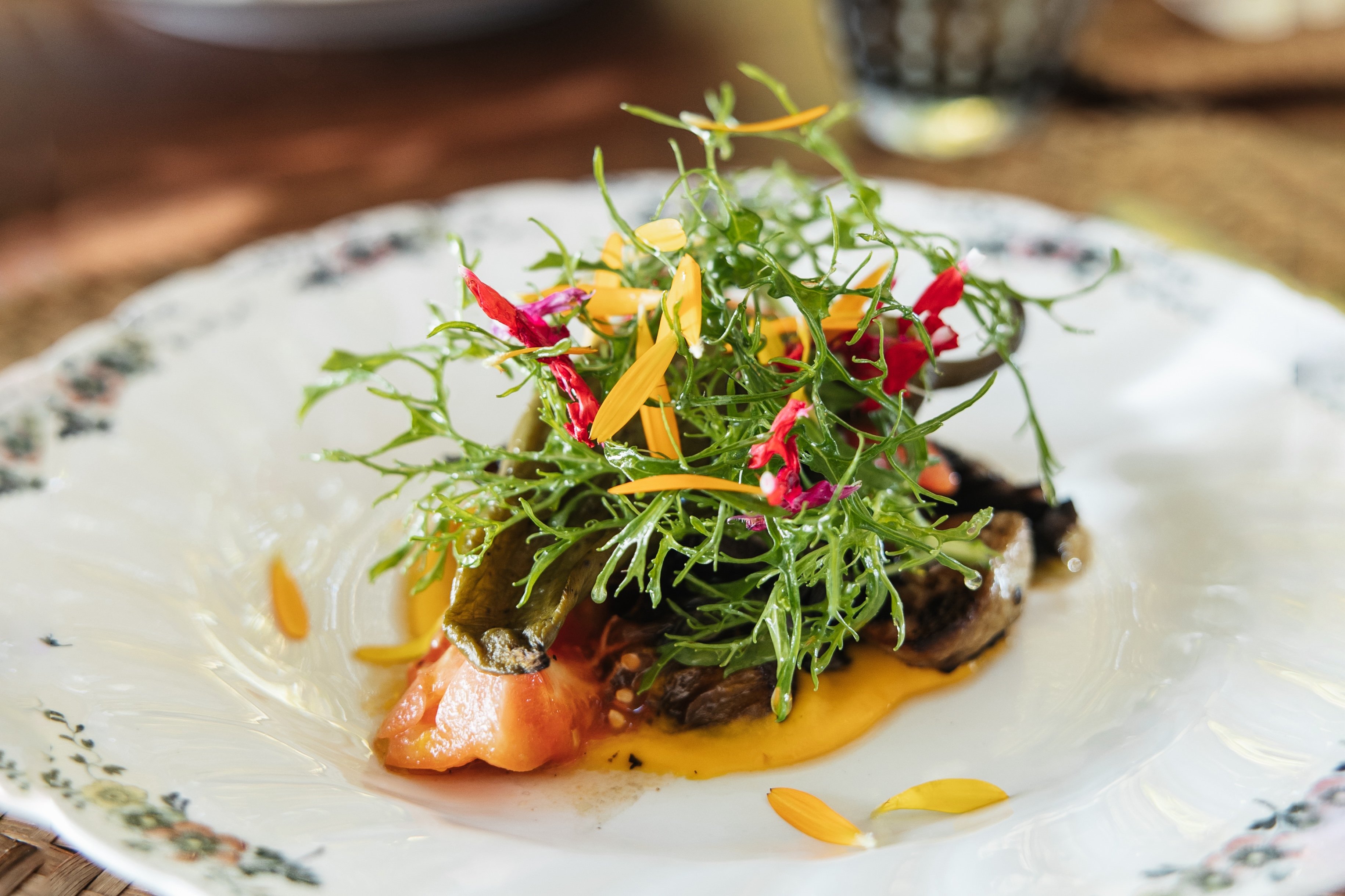 Operating on a seed-to-plate philosophy, head chefs Manuel Vargas and Nerea Ortiz de Urbina create colorful dishes from produce grown using permaculture and biointensive methods. Everything is estate-sourced – meat and eggs from the animals, olive oil from the groves, wine from chemical-free vines, honey from the hives. The menu changes daily but leans into rustic Spanish flavors with modern Mediterranean touches. Expect warm homemade bread and fresh ricotta as constants.