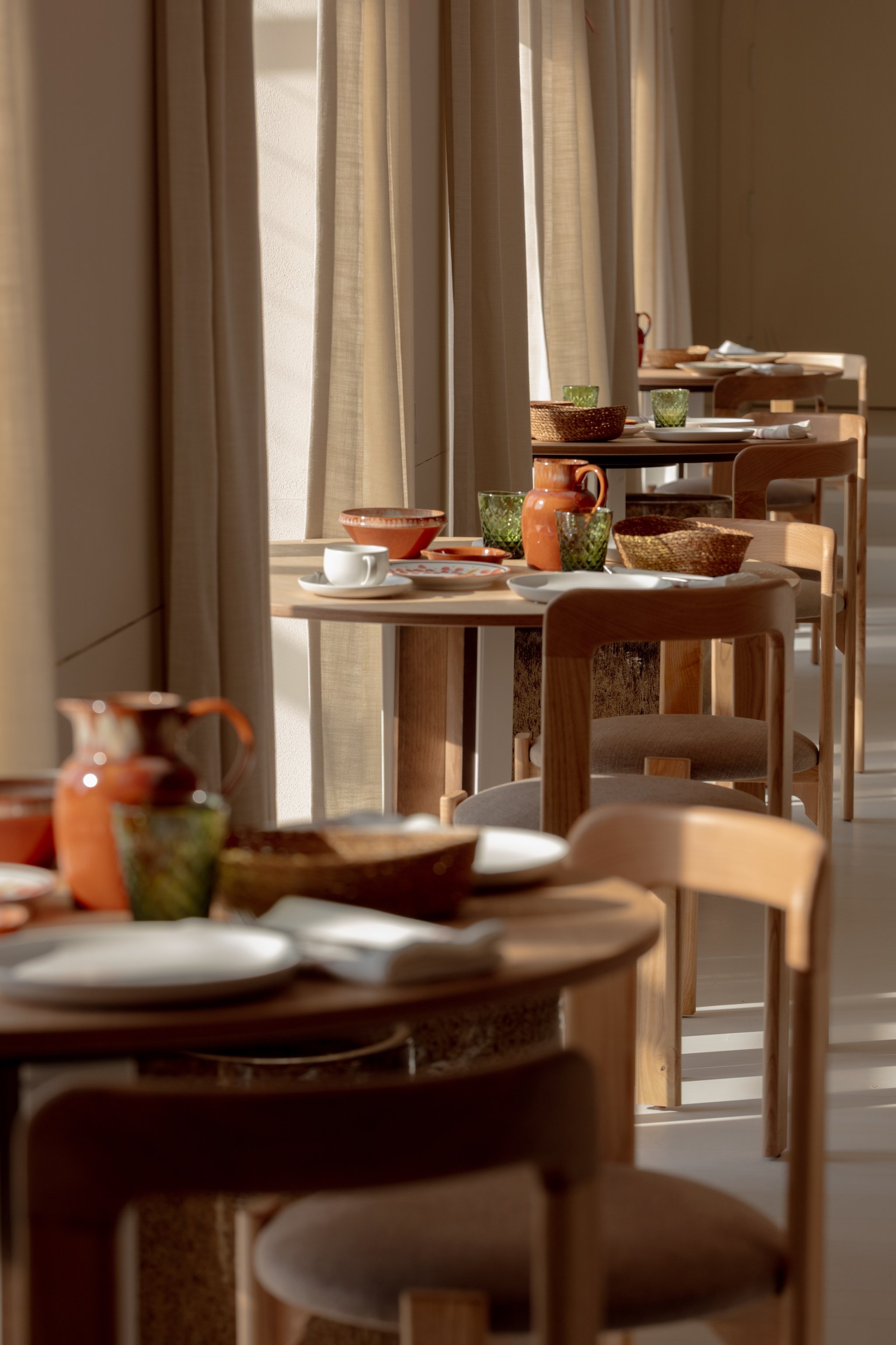 For breakfast, the same pea-gravel-lined courtyard becomes the airy breakfast dining room. The generous breakfast buffet includes a selection of cured meats and cheese from artisanal producers across Catalonia, local yogurt with fruit and granola, homemade baked goods and cakes, and eggs of any style available à la carte.