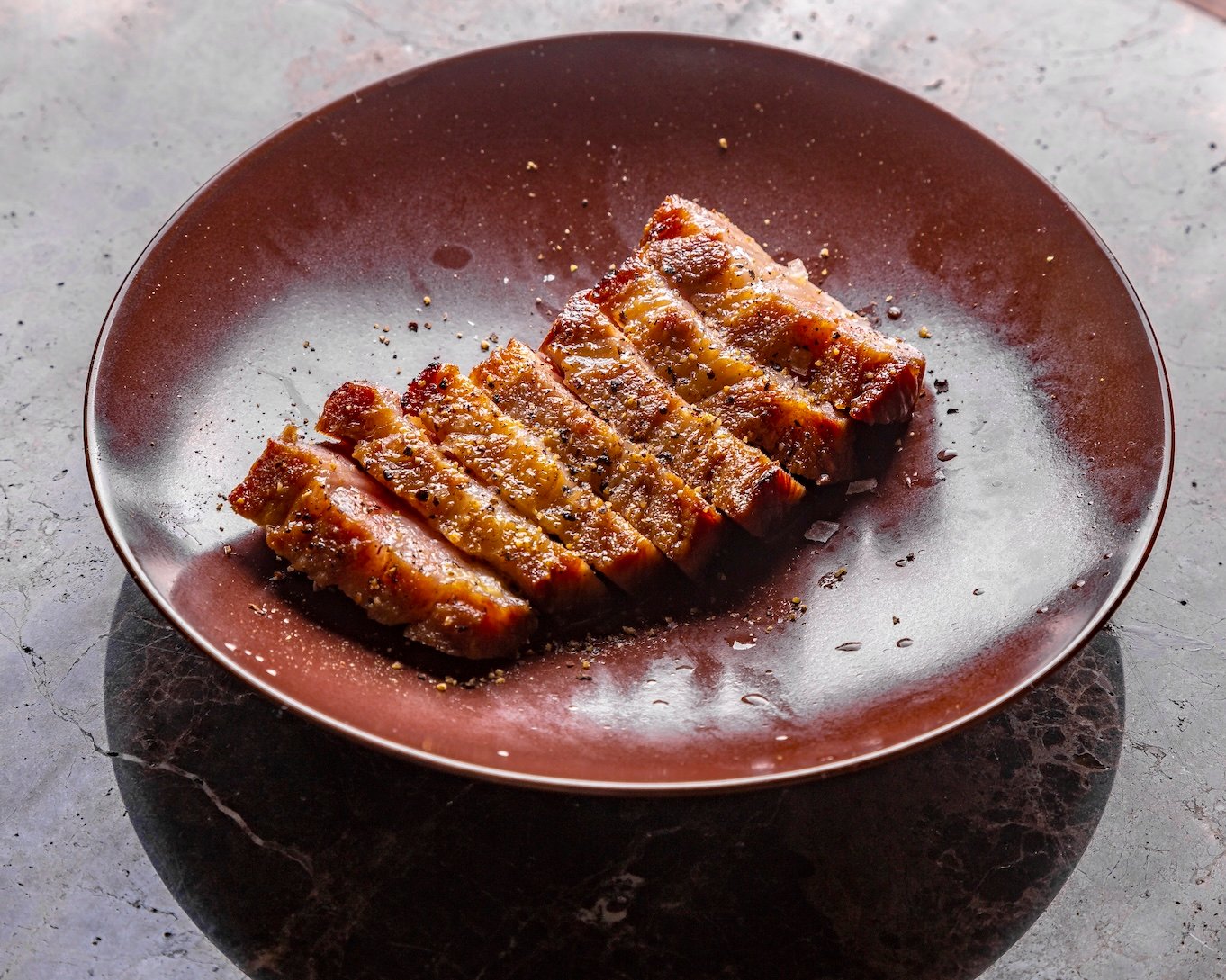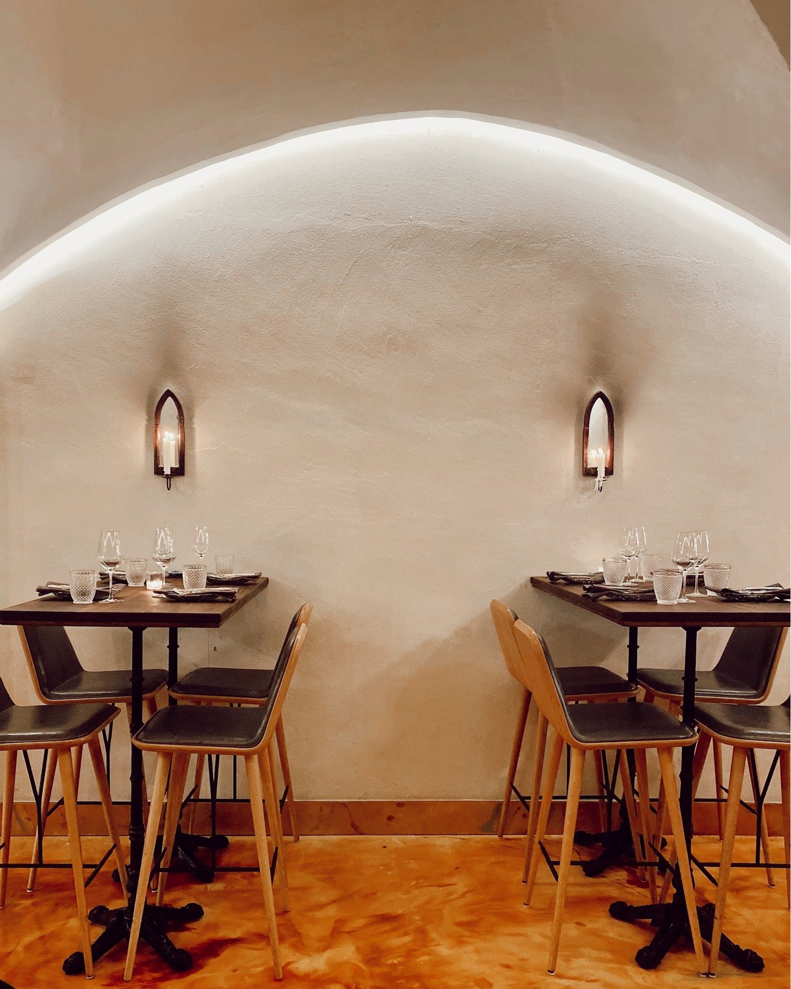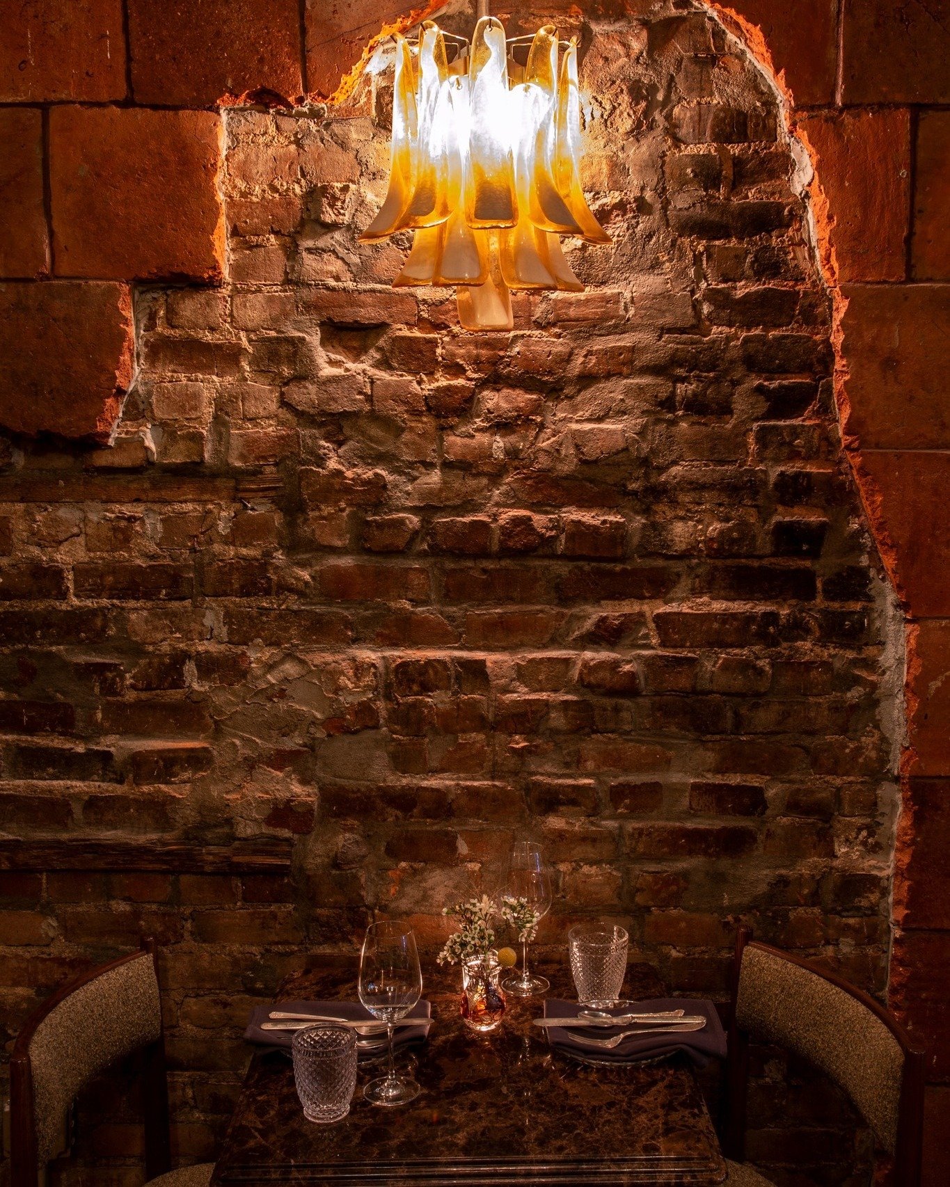 Past the front entrance, guests will be taken aback by the restaurant’s size: it’s more spacious than you’d think. Gothic-influenced architecture is imbued in a ribbed vault-style setting with curved and arched ceilings, creating pockets throughout the elevated dining scape. Elegant contemporary glass chandeliers hang from the roof, while ambient lighting facilitated by candles sparks a moody ambiance. It’s classy, not pretentious.
