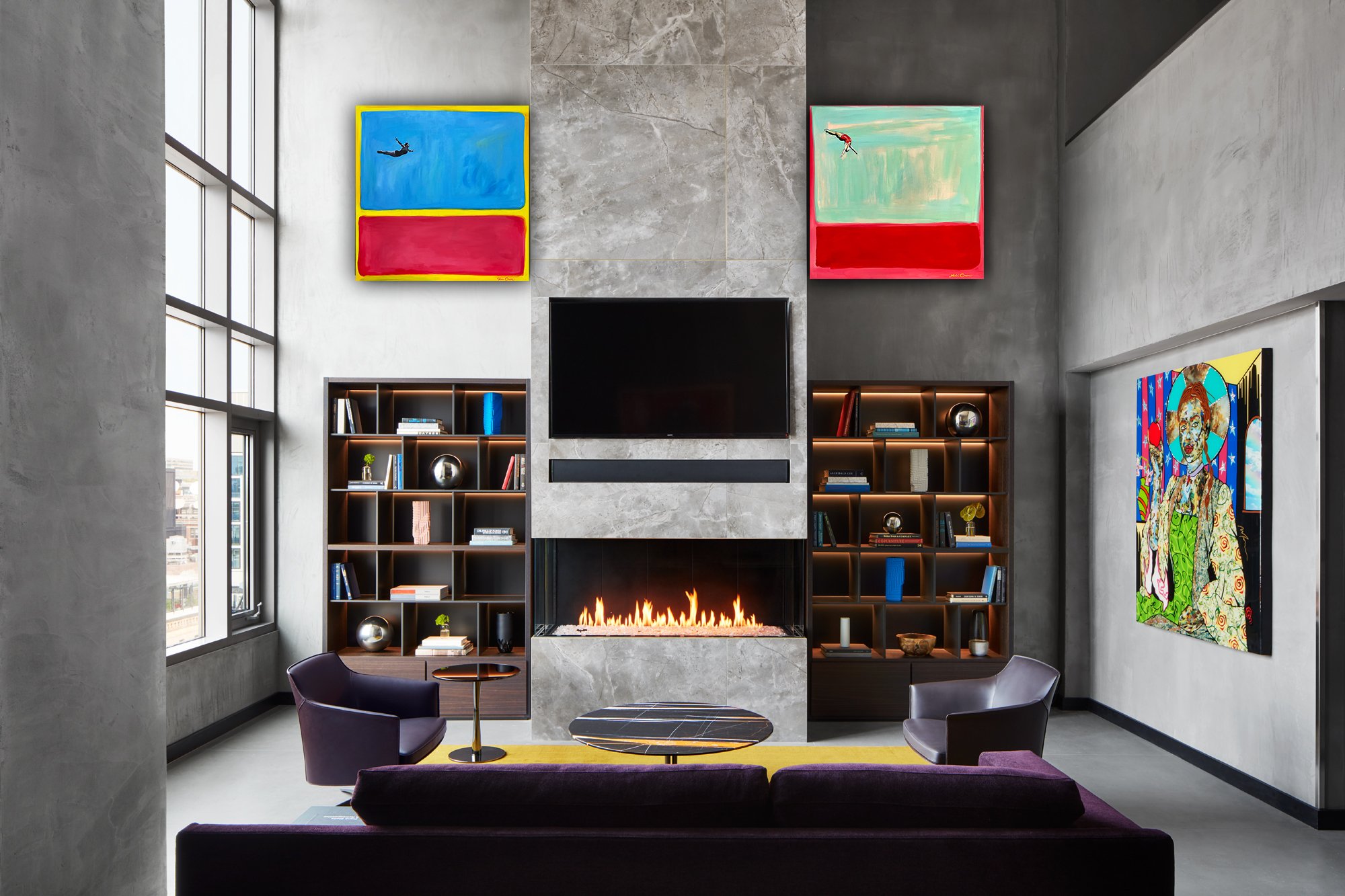 The two-floor penthouse, designed in collaboration with Italian furniture brand Poliform, boasts soaring ceilings, a sleek kitchen, a glass fireplace, and art by Frank Stella, Adi Oren, Daniel Mazzone, and Mick Rock.