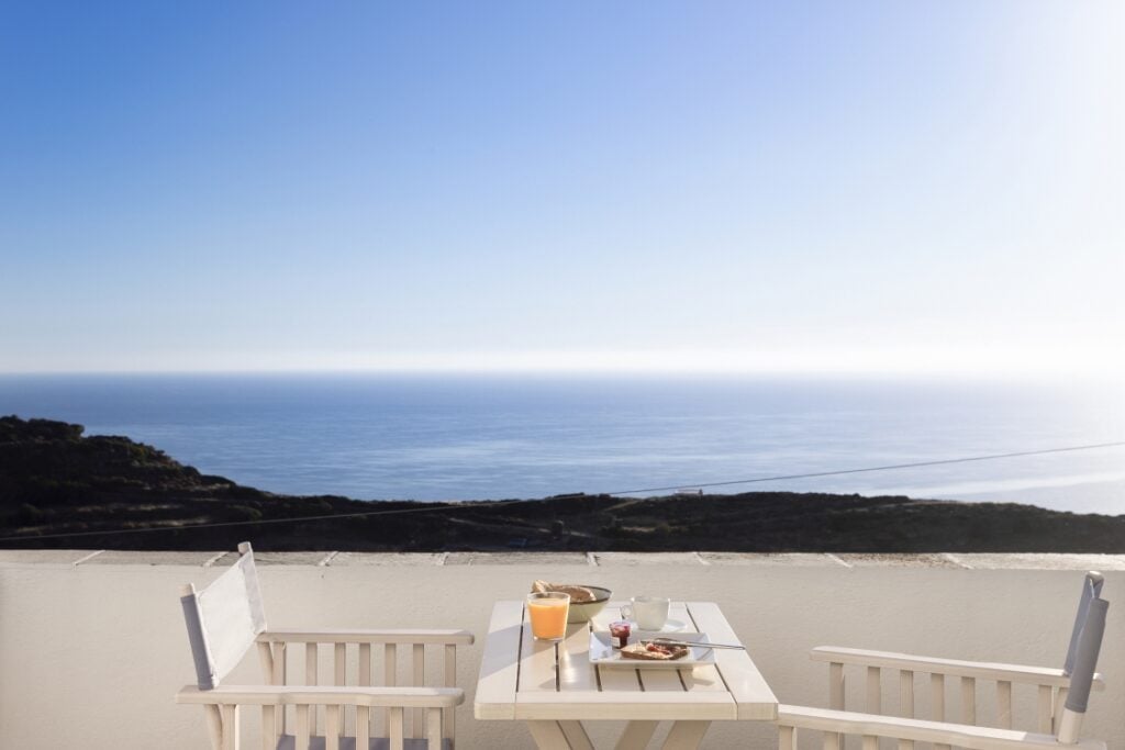 Accommodations at Gerofinikas are a study in understated elegance. Each of the rooms features a minimalist design with a subtle color palette of whites, creams, and soft blues that create a soothing atmosphere, while private balconies and terraces inspire guests to take a moment to soak in the sun.