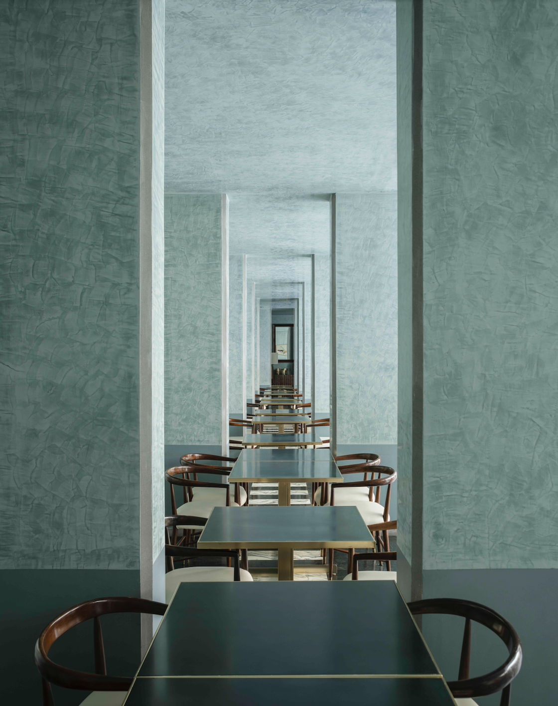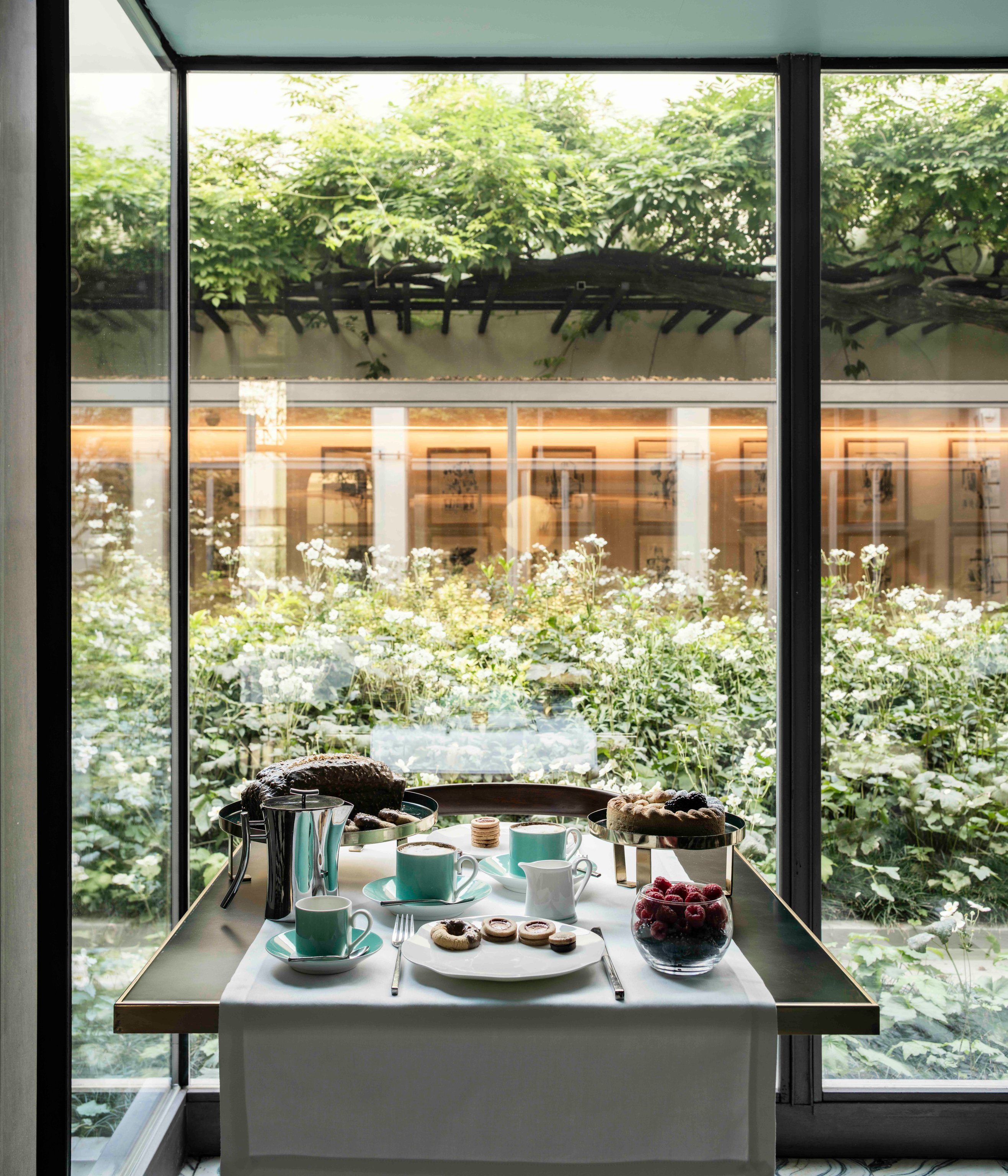 Mornings begin in a Scarpa-designed breakfast room overlooking a Japanese garden, where Tuscan produce, house-made pastries, and a dedicated vegan selection are arranged beneath walls lined with Giuseppe Chiari’s works.