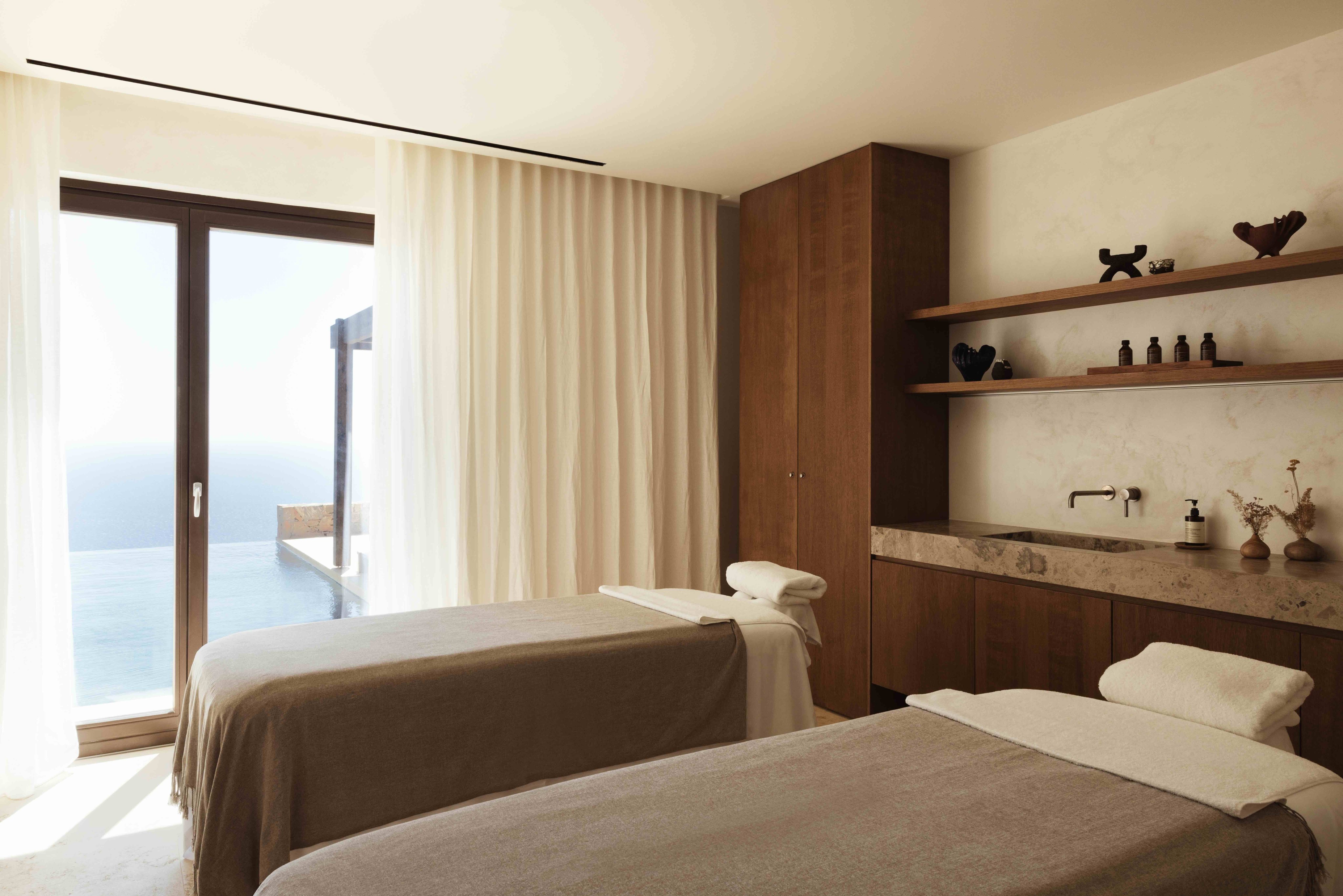 The subterranean spa channels ancient Greek healing rituals with a modern touch. Treatments use native herbs and mineral-rich tonics, while visiting practitioners lead sessions in meditation, energy healing, and yoga. The indoor mineral pool and cliffside deck set the stage for spiritual (and literal) elevation.