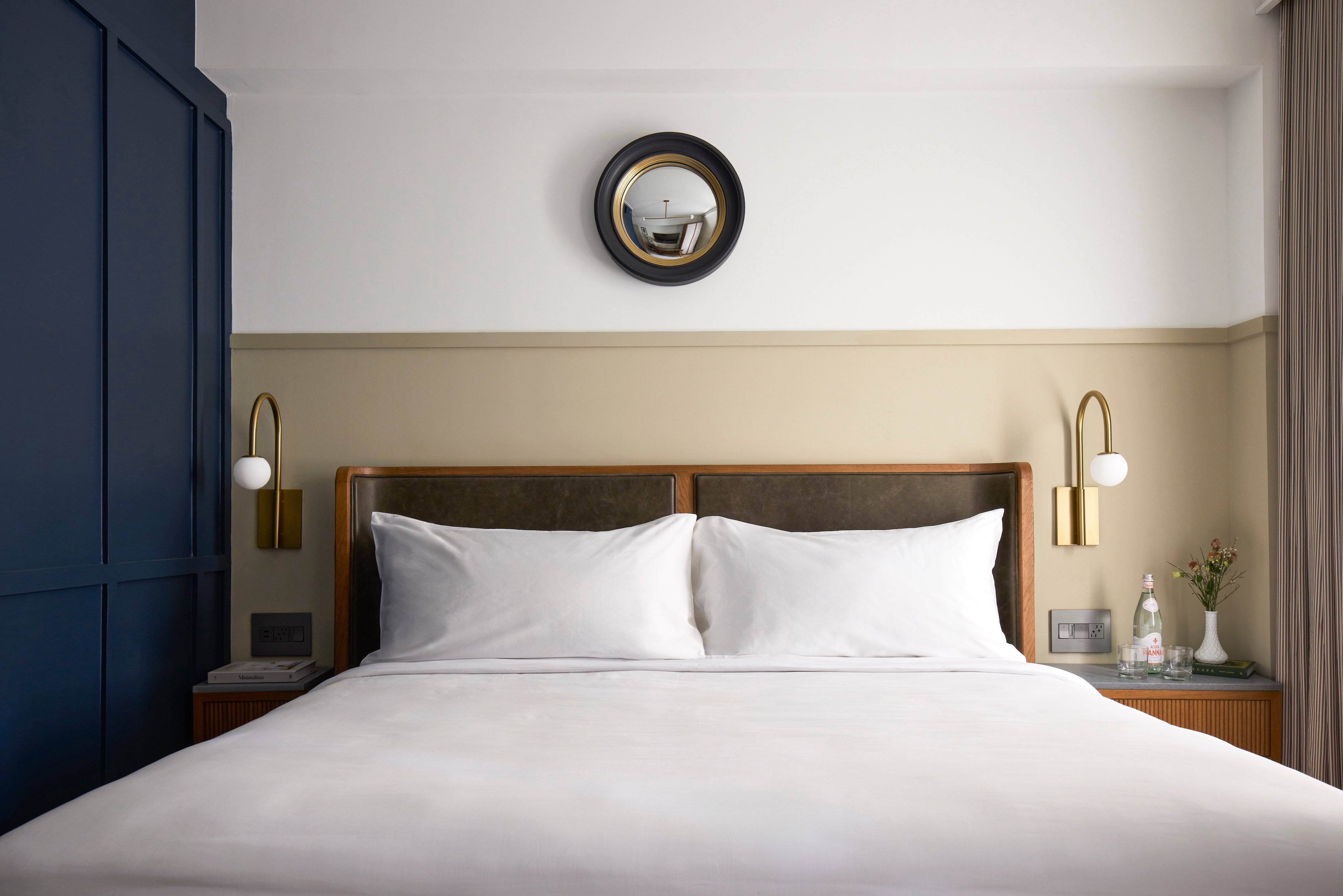 Guest rooms are spread across four floors, maintaining a distinctly nautical feel with dark navy blue finishes, brushed metal fixtures, and rounded mirrors. Velvet headboards add a level of sophistication to the cozy rooms, and luxe curtains help to keep the strong Virginia sun at bay in the morning. Bathrooms come complete with Grown Alchemist bath amenities, and you’ll want to live in the Frette bathrobes and slippers that come standard with all rooms.