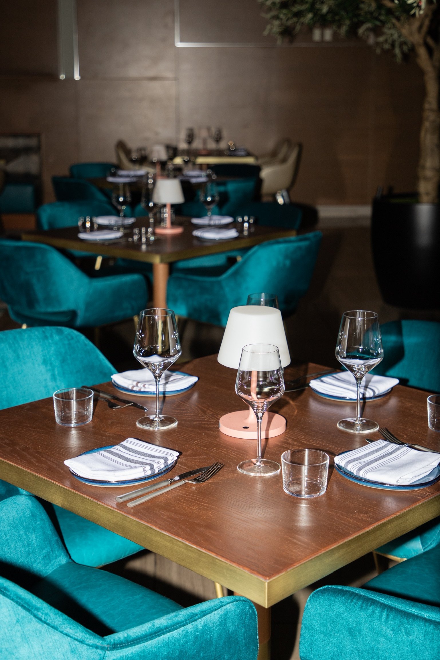 Enter Catria Cucina,an Italian-inspired restaurant near Hudson Yards that masterfully blends Manhattan’s polished workday energy with the effortless elegance of coastal Italy. The 80-seat dining room features contemporary design touches: plush blue-green velvet seating, sleek brown wooden tabletops, and warm neutral accents. An overhead atrium, adorned with lush greenery, creates an indoor-outdoor feel that elevates the entire dining experience.