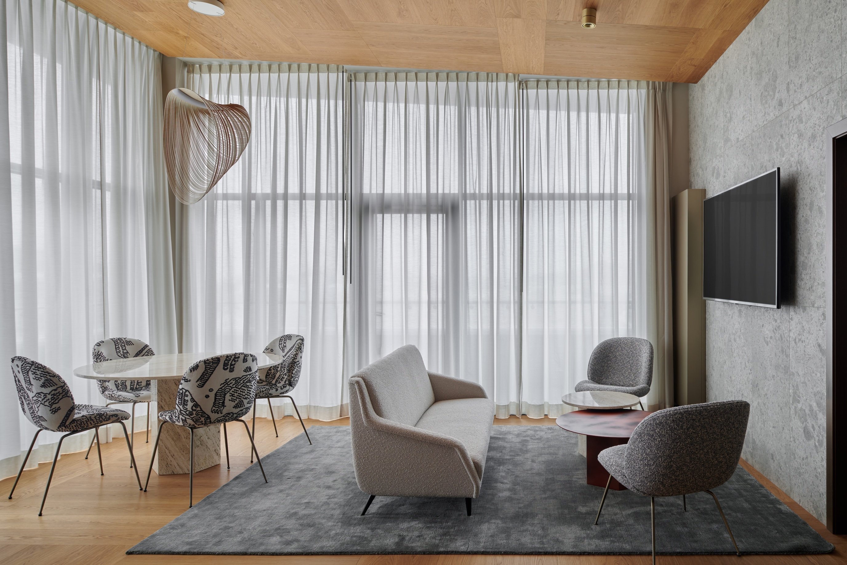 Guest rooms are arranged with clarity and care. Wood warms the space; fabrics bring softness. There’s a gentle curve in the headboard that wraps the bed like an embrace. Blackout curtains draw the night inward. A custom-built nook holds an espresso machine. The desk is solid oak.