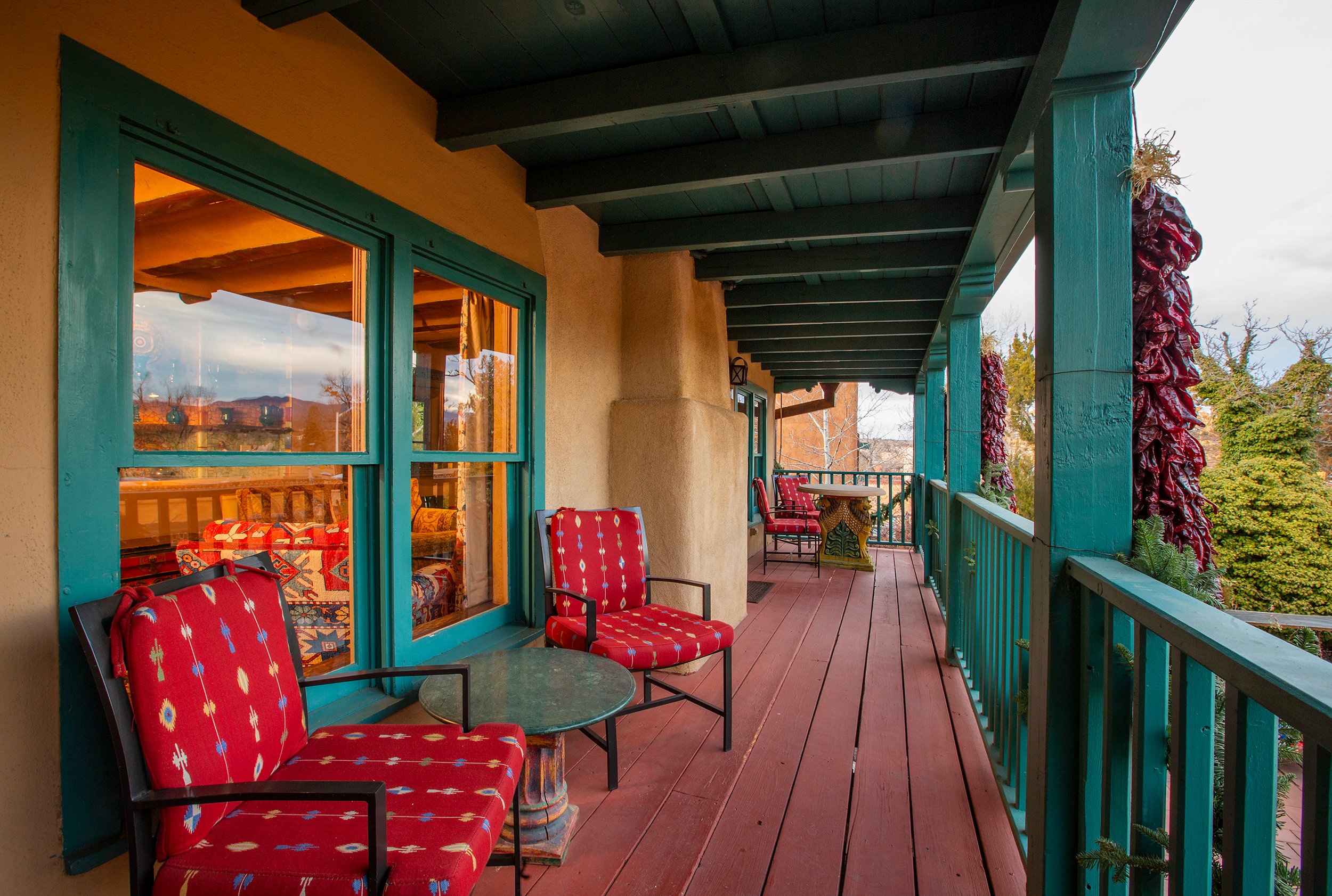 The design immediately stands out when guests enter the Inn of the Five Graces in Santa Fe, New Mexico. Rich, colorful textiles with bold patterns used for rugs, wall hangings, and canopies; intricate tile mosaics; carved wooden furniture; and hanging glass lanterns call to mind Central and South Asia.