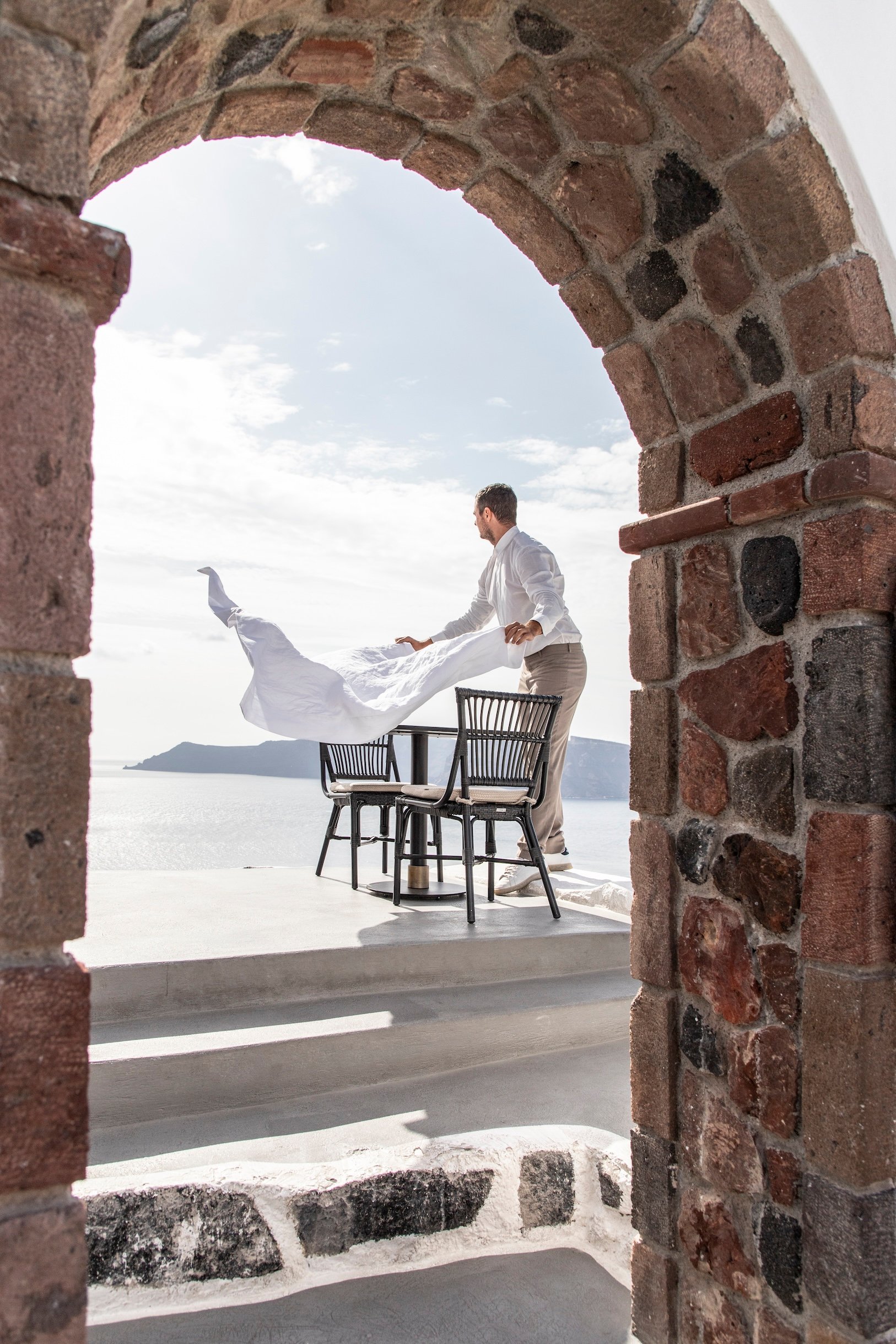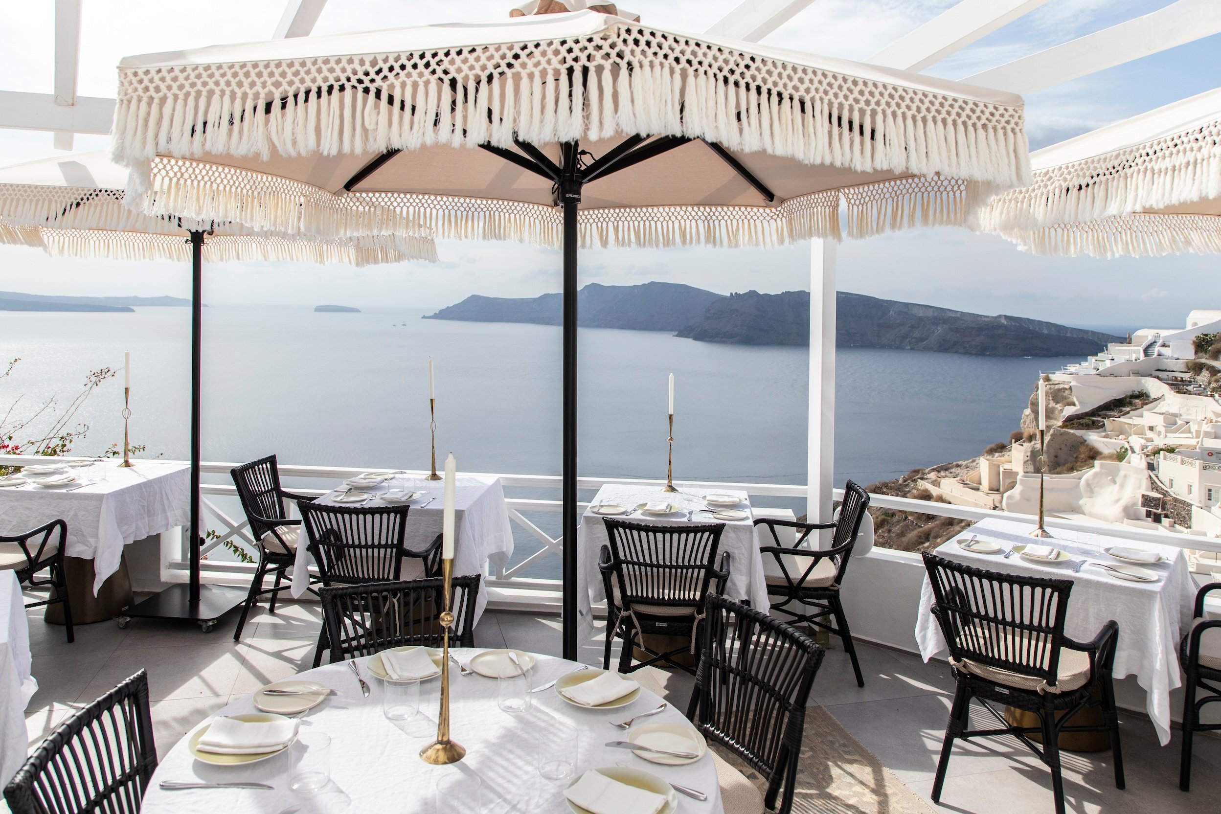 Guests dine on the wraparound outdoor patio overlooking the caldera, where stunning white-washed architecture cascades down to the sea. Crisp white linen tablecloths elegantly drape over the tables, while trellises and chic fringed parasols provide shade on hot summer days. Although dining outside with the views is preferred, the indoor setup offers a worthy alternative with a cozy ambiance and an inviting cocktail bar shielded by a glossy black marble counter.