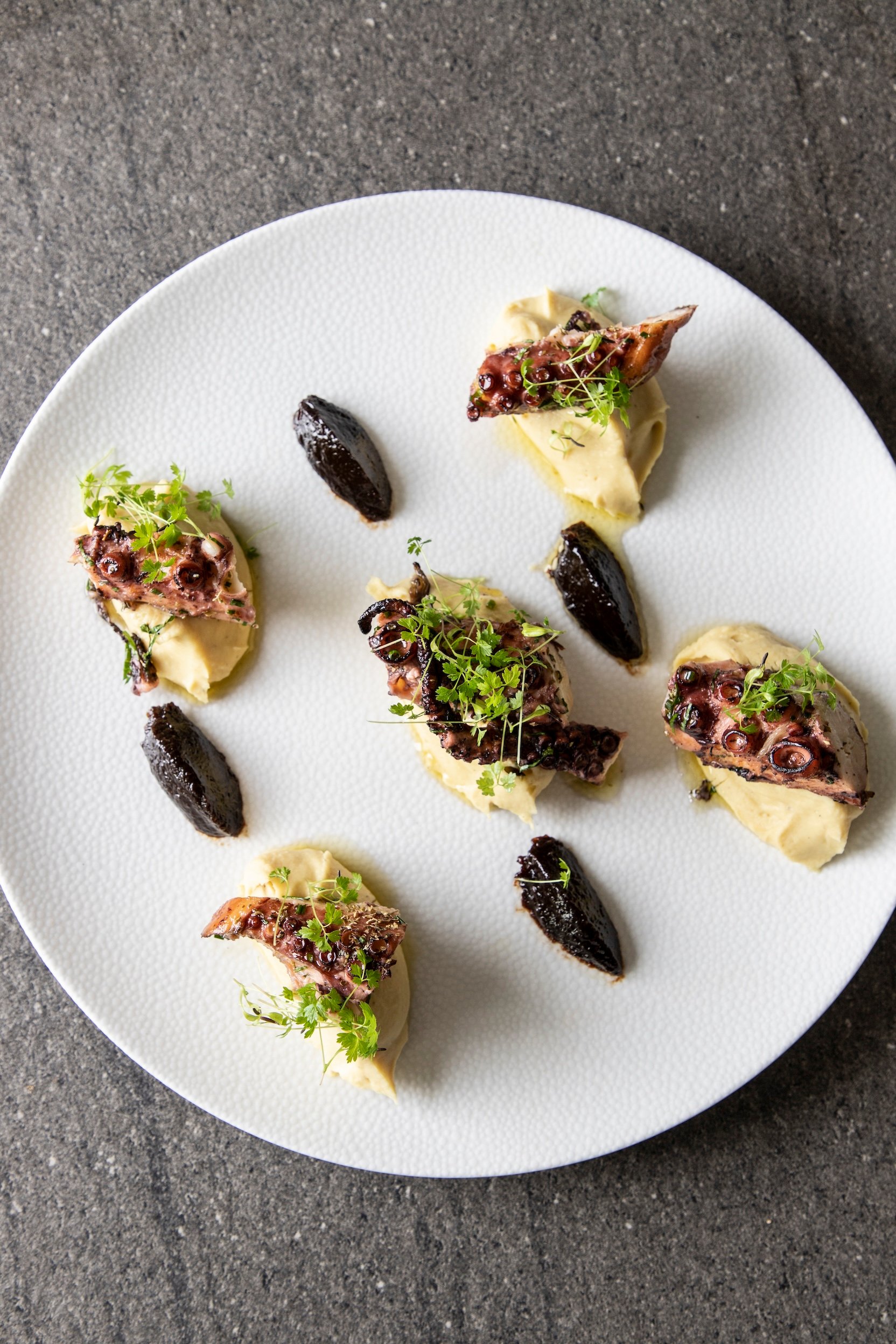 Next, we savored the grilled octopus, which arrived pre-cut into pieces and plated over a generous scoop of Santorinian fava bean mousse and caramelized onion chutney. The handmade crispy potatoes served with the creamiest goat cheese and Greek black truffle shavings, were equally delightful. Our stomachs were already satisfied after the appetizer round. Despite our fullness, if we could have added one more item, it would have been the sea bass carpaccio with caviar.