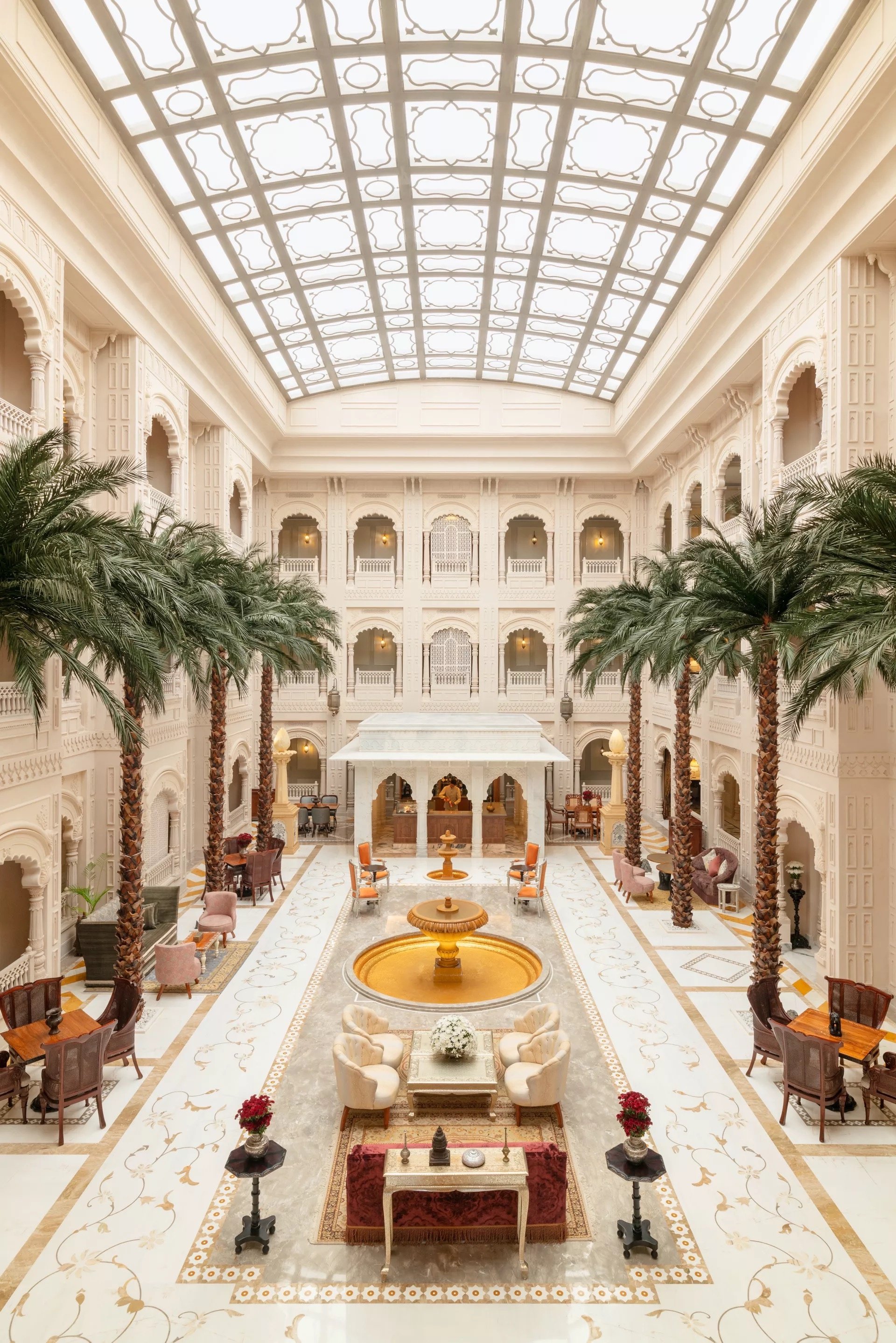 Located in the heart of Jaipur, the luxe Raj Palace is a historic gem initially built in 1727, once the residence of the Maharaja of Jaipur. With 50 luxurious rooms and suites, this Small Luxury Hotels of the World member showcases Rajput and Mughal architecture, featuring opulent furnishings, intricate frescoes, and expansive courtyards.