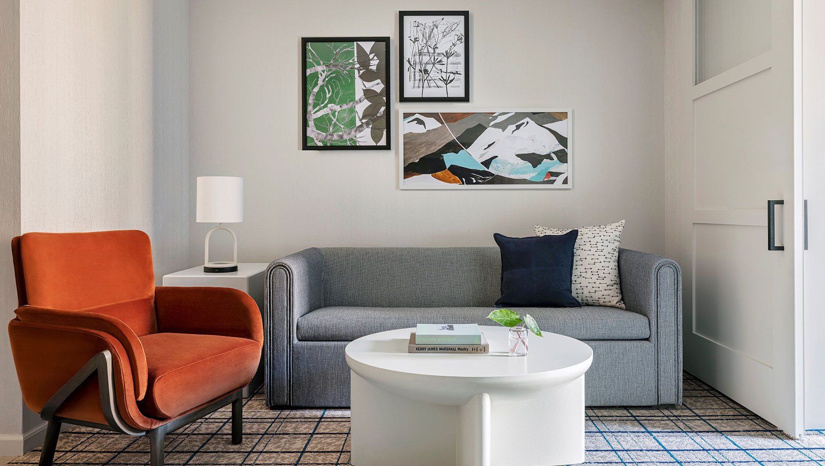 Spacious rooms and suites embody understated, yet contemporary luxury with carpeted striped floors, heavy gray curtains, and pops of cerulean and burnt orange fabrics. Artwork tastefully nods to Utah’s stunning terroir with modern portraits of mountains and trees, often modeled after the Wasatch Mountain views that can be seen from most of the rooms’ vantage points. Bathrooms, which house Atelier Bloem skincare products, are also large and welcoming with many upper-floor suites containing soaking tubs and walk-in showers.